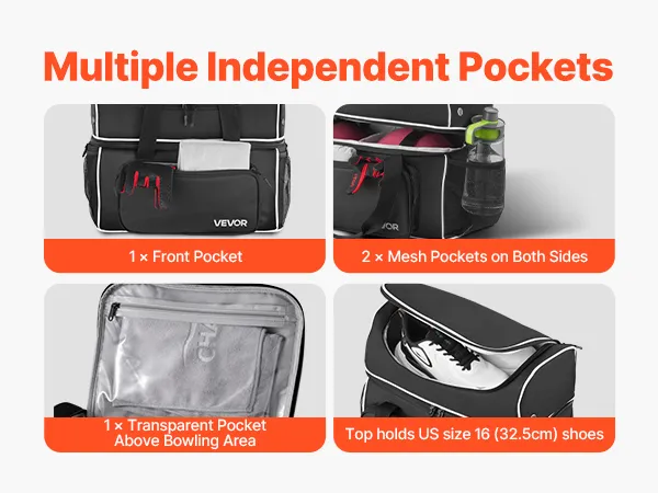 Ta torba do kręgli na kółkach posiada wiele kieszeni: jedną z przodu, dwie z siatki po obu stronach oraz jedną przezroczystą nad powierzchnią do gry w kręgle. Regulowana przegroda z polietylenu ułatwia przechowywanie.