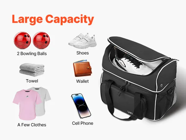 Duża pojemność: Główna komora tej torby do kręgli bezpiecznie pomieści dwie standardowe kule, posiada osobną przegrodę na buty oraz kieszeń na akcesoria. Górna kieszeń z siatki umożliwia szybki dostęp do drobiazgów, co czyni ją idealną dla miłośników kręgli.