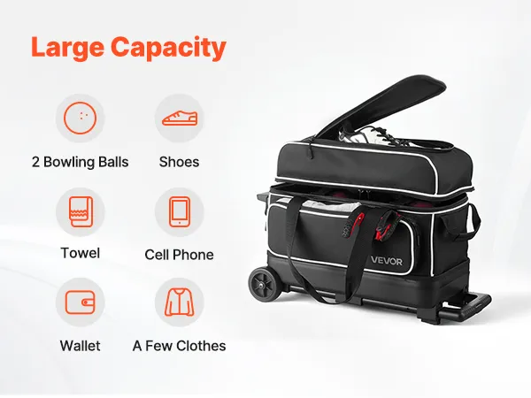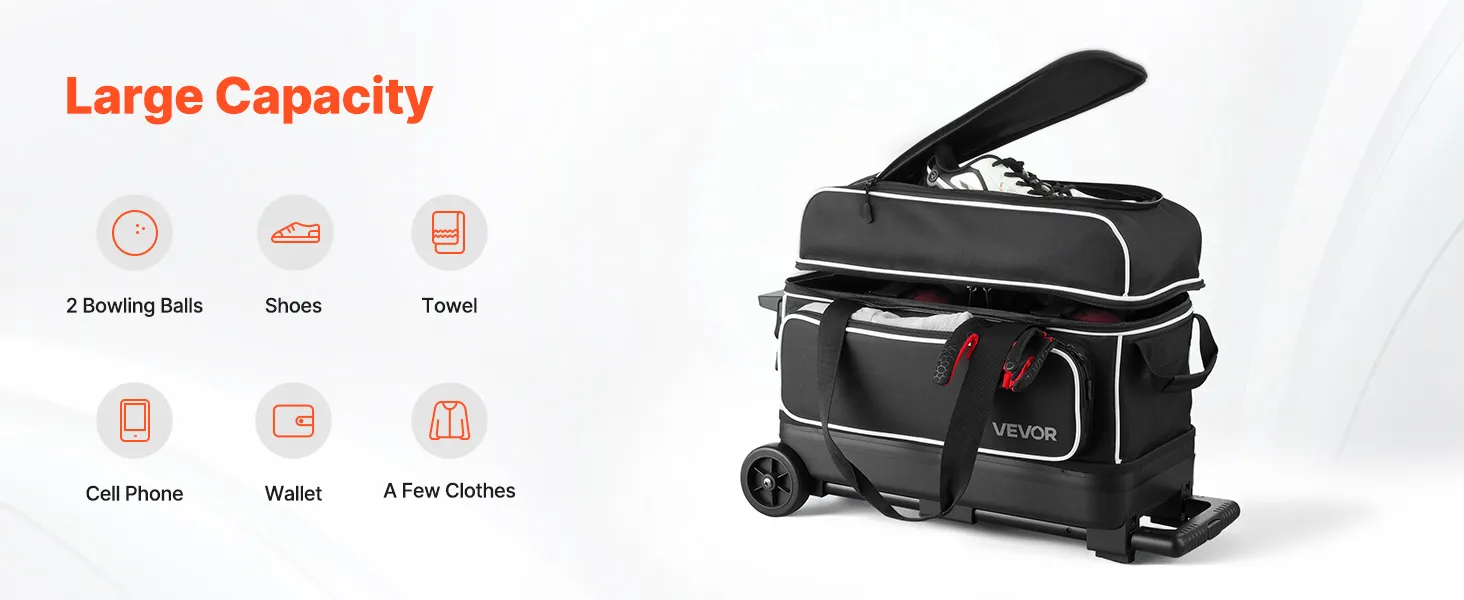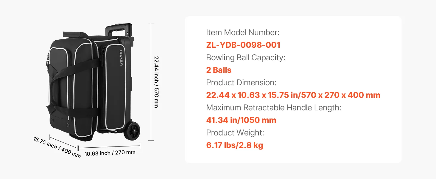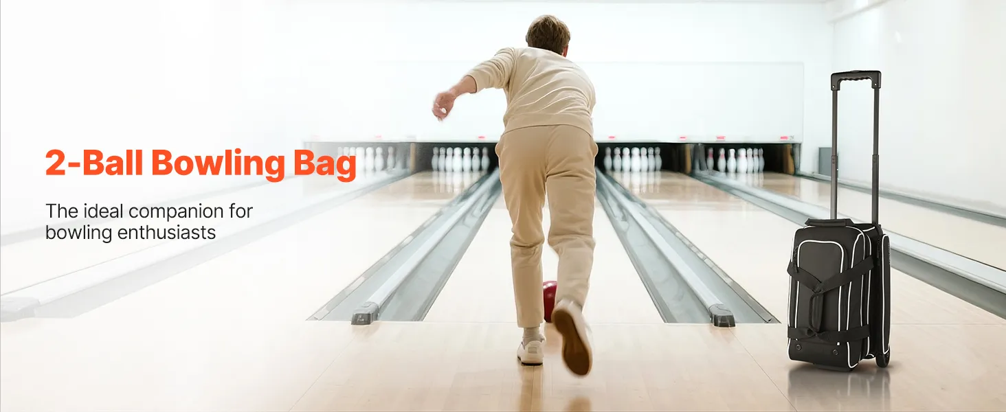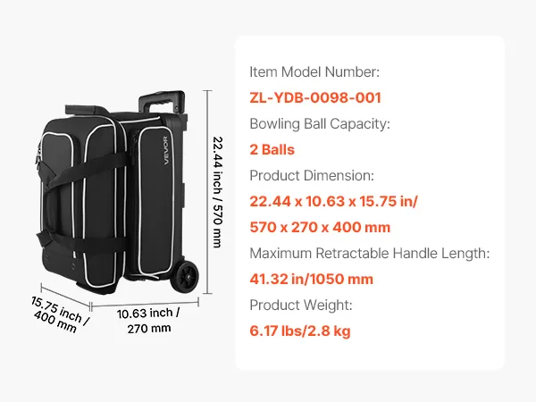 Torba na kule do kręgli VEVOR na 2 kule z podwójnymi kółkami i oddzielną przegrodą na buty (do rozmiaru US 16) oraz dużą kieszenią na akcesoria, wysuwaną rączką, rozciąga się do 105 cm, kolor czarno-biały