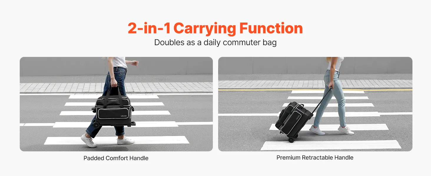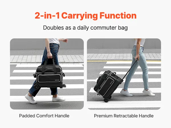 Regulowany uchwyt teleskopowy i uchwyt na rzep torby do kręgli z kółkami umożliwiają zarówno noszenie, jak i ciągnięcie, zwiększając mobilność o 50%.