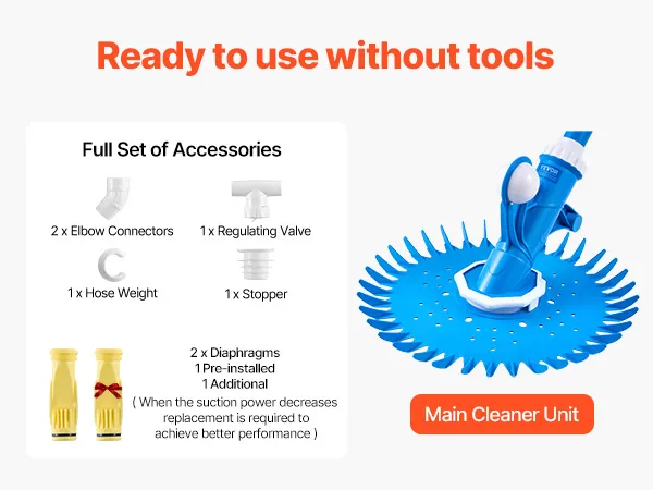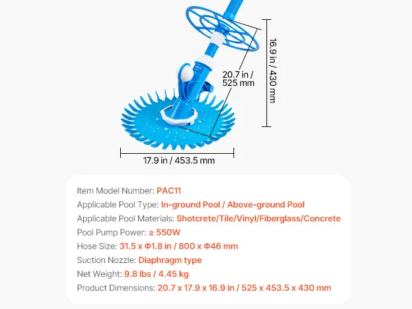 Nadaje się do różnych basenów: Nasz odkurzacz basenowy idealnie nadaje się do różnych powierzchni basenowych, w tym betonu natryskowego, płytek, winylu, włókna szklanego i betonu. Dzięki regulacji przepływu i długości węża, może on szybko przesuwać się po dnie basenu i wspinać się po ścianach, usuwając zanieczyszczenia bez zatykania. Należy pamiętać, że ten odkurzacz nie nadaje się do czyszczenia schodów ani dużych liści.