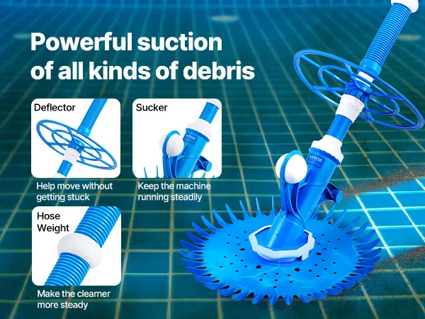 Mocne czyszczenie: Ten odkurzacz basenowy jest wyposażony w wydajny system ssący, który automatycznie obraca się i porusza, zasysając brud, zanieczyszczenia, nasiona drzew, włosy i inne zanieczyszczenia z dna basenu. Nawet uporczywe plamy są usuwane bez wysiłku, zapewniając Tobie i Twojej rodzinie czystsze środowisko pływania. Zwiększ stabilność odkurzacza.