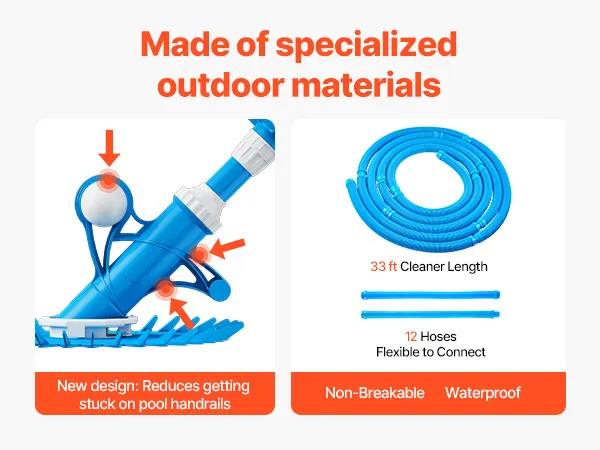 Wysokiej jakości wąż: Ten odkurzacz basenowy jest wyposażony w 12 węży o łącznej długości 33 stóp (ok. 10,7 m), dzięki czemu idealnie nadaje się do czyszczenia dużych basenów (ok. 6,1 m x 10,7 m). Długość węża można dostosować do potrzeb basenu, a szczelne i bezpieczne połączenia zapobiegają przeciekom. Aby ułatwić podłączenie i zwiększyć elastyczność, przed podłączeniem należy zanurzyć oba końce węża w wodzie.