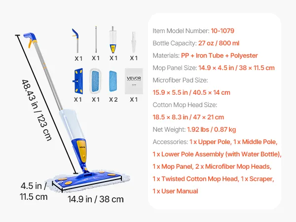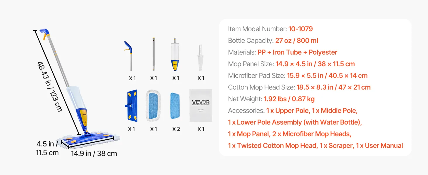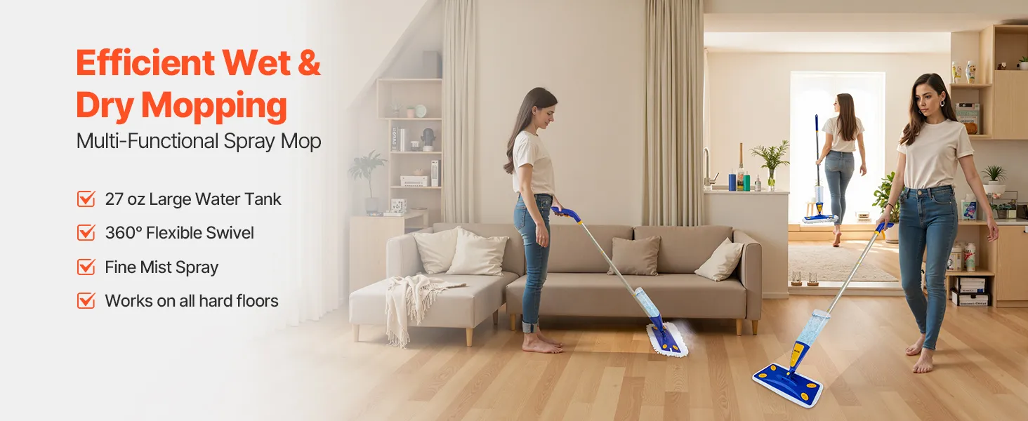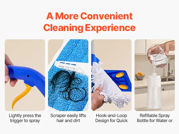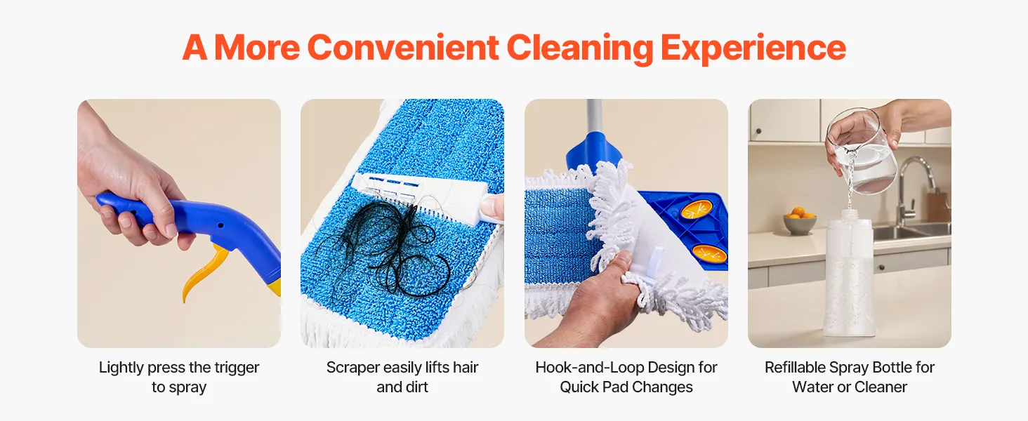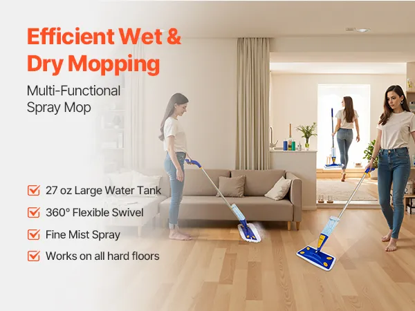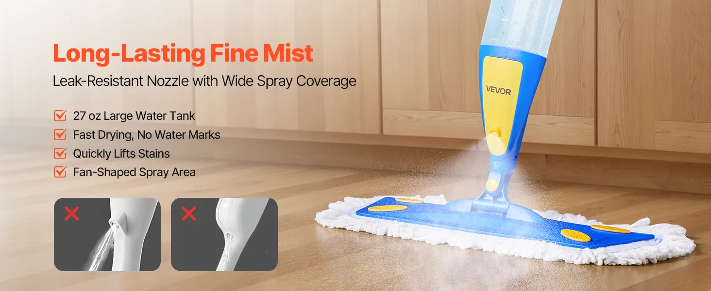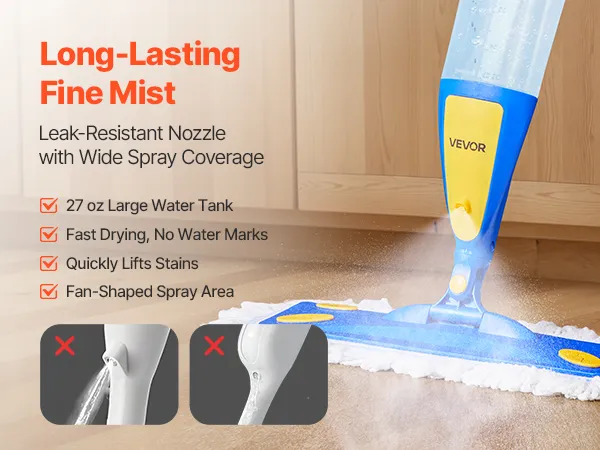 Efektywne i bezproblemowe czyszczenie: Koniec z ciężkimi wiadrami! Wystarczy napełnić zbiornik mopa ze spryskiwaczem, nacisnąć spust, a spryskiwacz uwolni delikatną, równomierną mgiełkę. W porównaniu z tradycyjnymi mopami, oszczędza wodę i zwiększa wydajność czyszczenia. Ulepszona, szczelna konstrukcja zapewnia szybkie schnięcie bez zacieków, dzięki czemu czyszczenie podłóg jest łatwiejsze i skuteczniejsze.