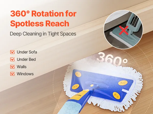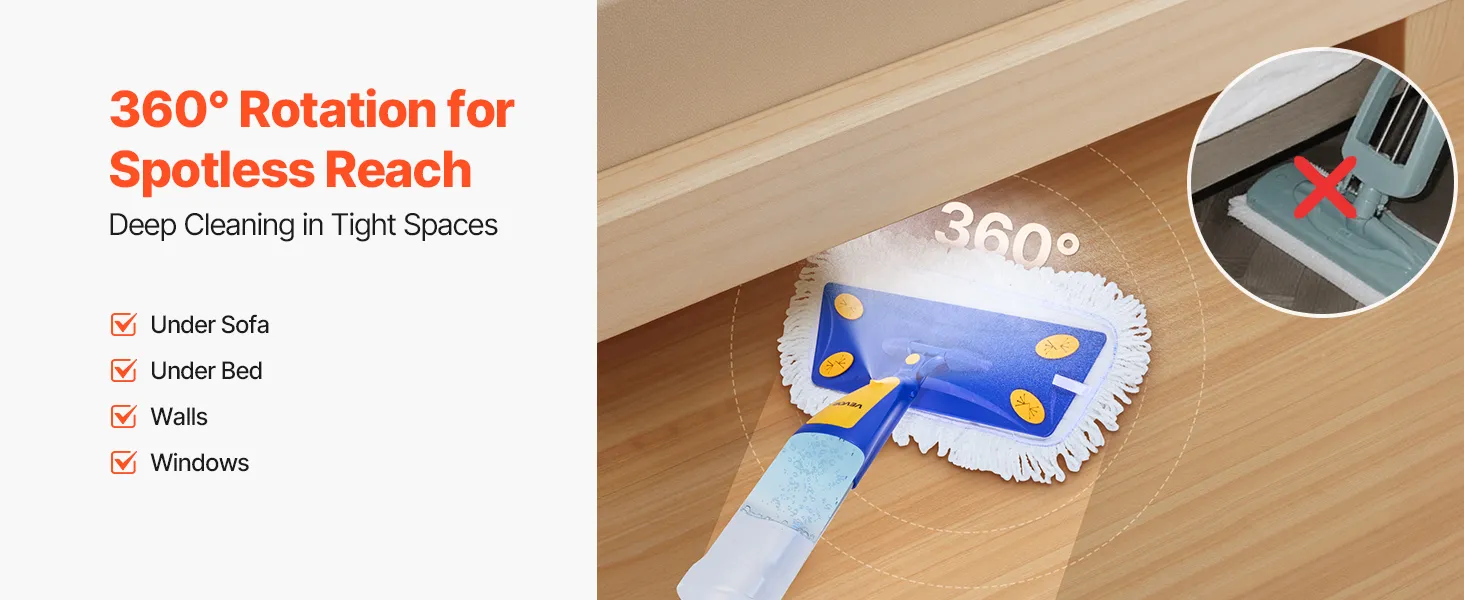 Obrotowa głowica mopa 360°: Ten mop podłogowy z funkcją spryskiwania wyposażony jest w elastyczną, obrotową głowicę 360°, która z łatwością dociera pod łóżka i sofy, a także do narożników ścian i trudno dostępnych miejsc. Głowica obraca się o 180° do przodu/do tyłu i 180° w lewo/prawo, umożliwiając dokładne czyszczenie bez konieczności przesuwania mebli.