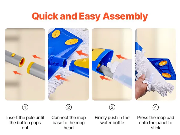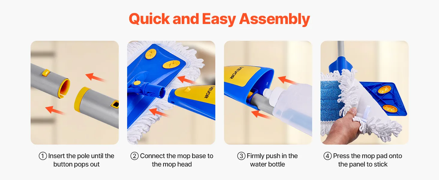 Montaż tego mopa ze spryskiwaczem jest łatwy. Wystarczy wsunąć drążki, aż przycisk wyskoczy, połączyć podstawę mopa z głowicą mopa, mocno wsunąć zbiornik na wodę i docisnąć nakładkę mopa do podstawy, aby zakończyć montaż.