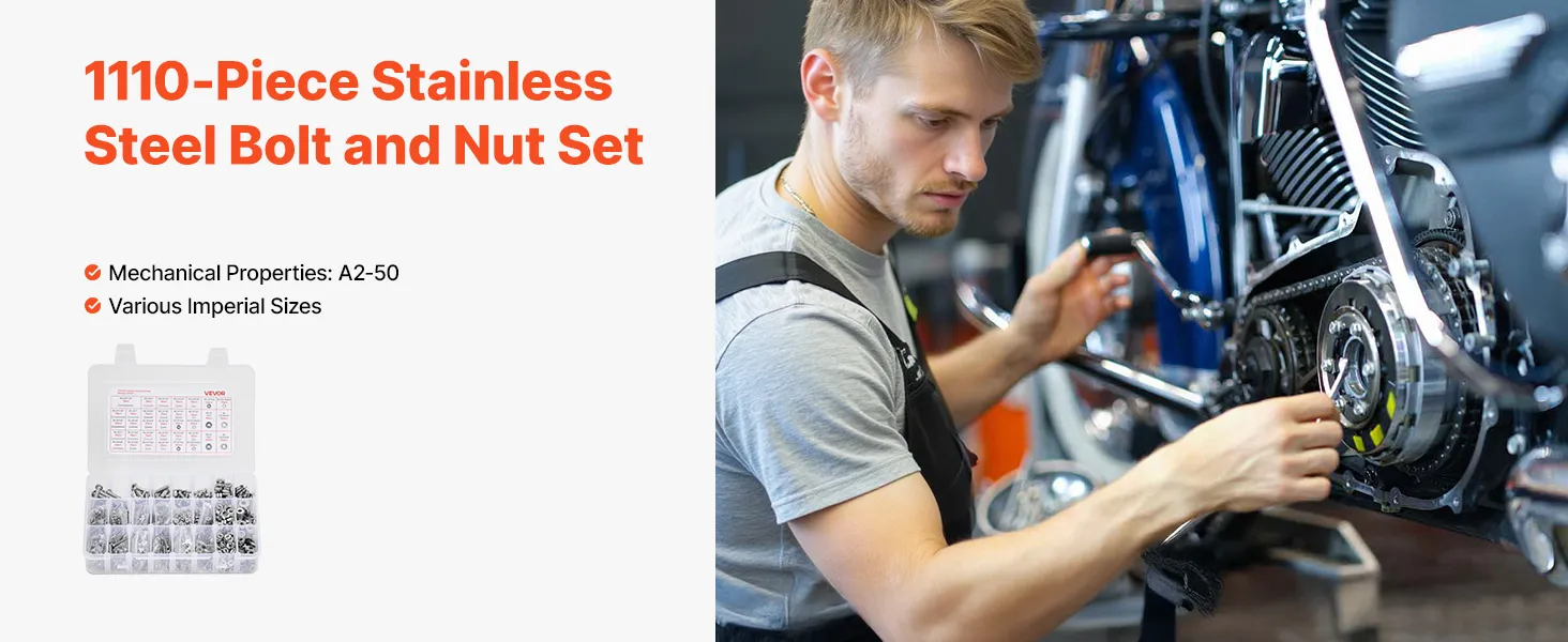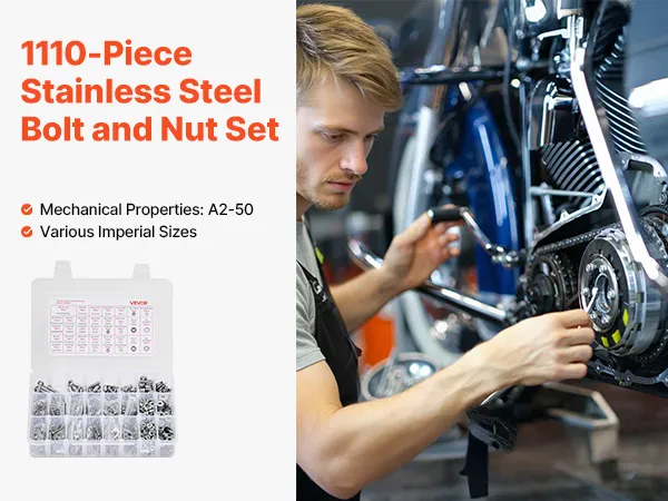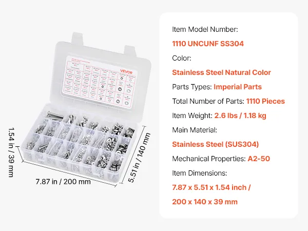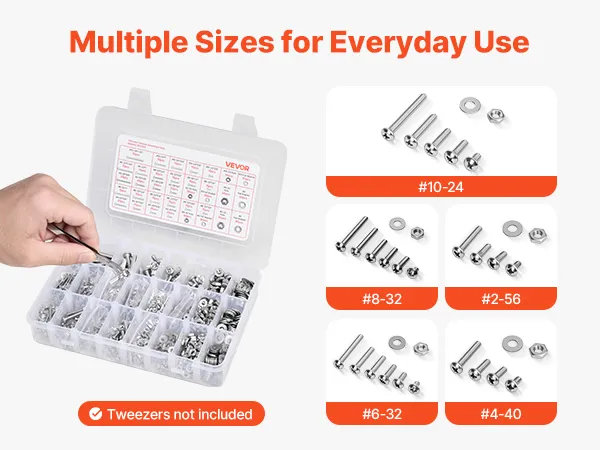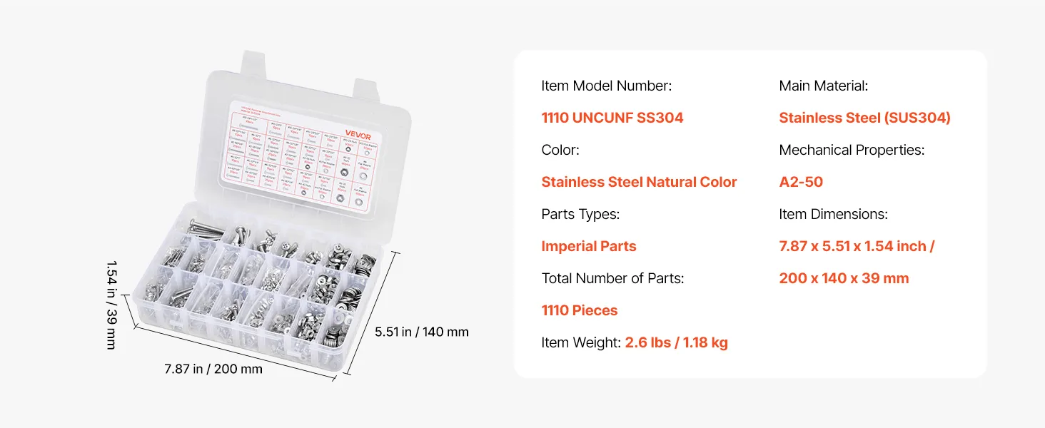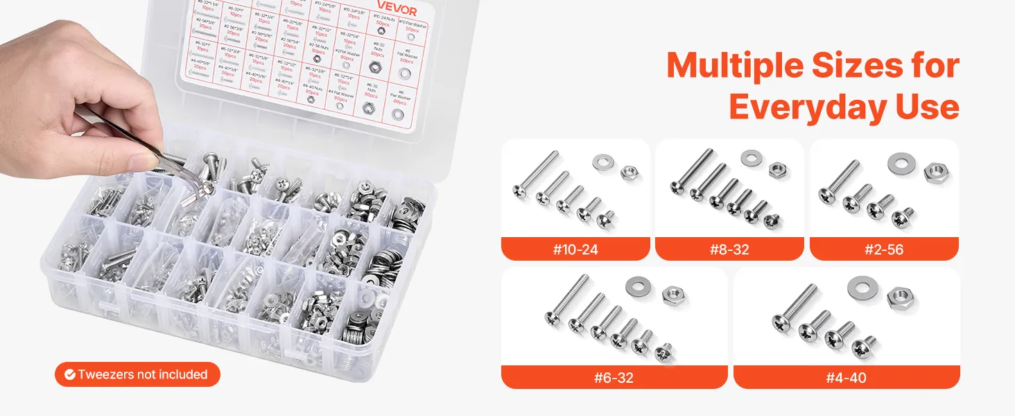 Zestaw śrub i nakrętek VEVOR, 1110 elementów, śruby maszynowe i podkładki calowe, stal nierdzewna 10-24, 8-32, 2-56, 6-32, 4-40, do montażu mebli/sprzętu AGD/pojazdów, kolor srebrny