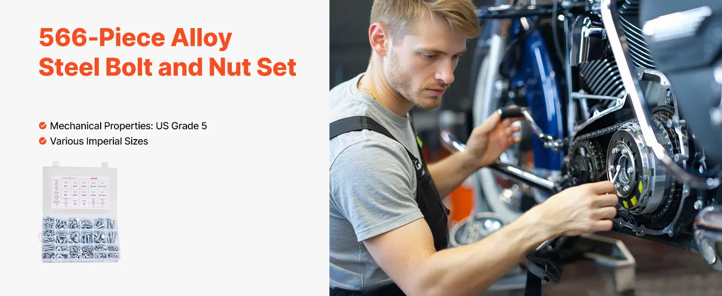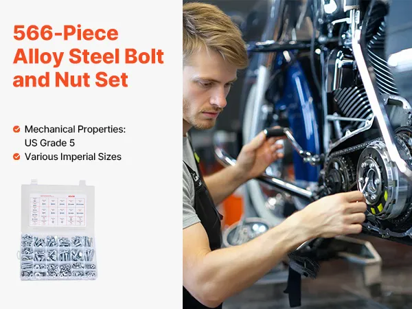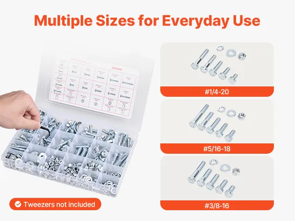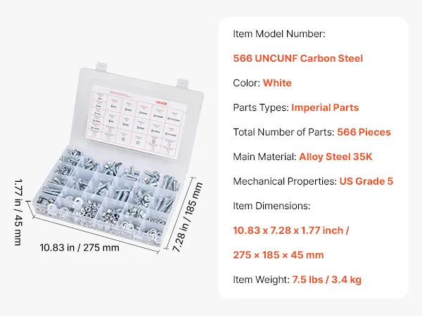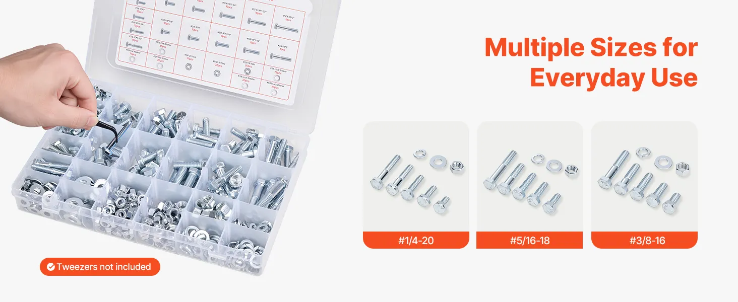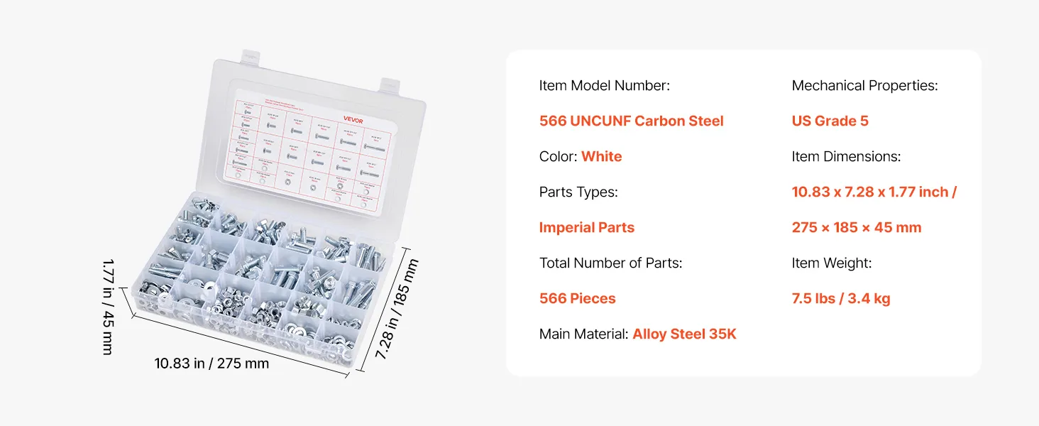 Zestaw wielospecjalistyczny składający się z 566 elementów: Ten praktyczny zestaw zawiera śruby calowe, nakrętki i podkładki w rozmiarach #1/4-20, #5/16-18, #3/8-16 (w tym podkładki płaskie i sprężyste w rozmiarach #1/4, #5/16, #3/8) o różnych długościach