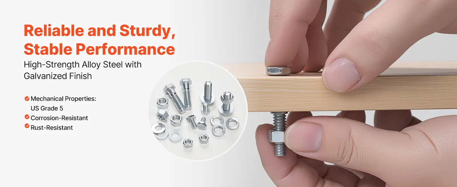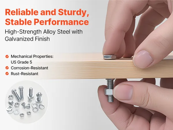 Solidny materiał ze stali stopowej: Wykonany z wysokiej jakości stali stopowej dla długotrwałej trwałości i stabilności. Ocynkowana powierzchnia poprawia odporność na korozję i zapewnia, że śruby i nakrętki pozostają odporne na rdzę i działają prawidłowo w różnych warunkach.