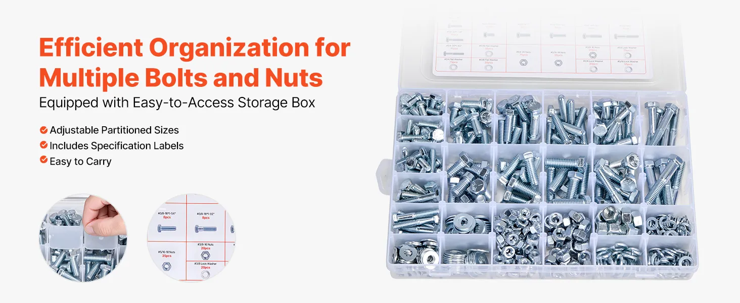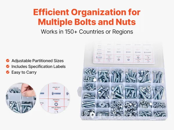 Dzięki szerokiemu wyborowi śrub, nakrętek, podkładek i innych komponentów w różnych rozmiarach zestaw ten zapewnia solidne połączenia różnych materiałów, ułatwiając znalezienie odpowiednich części do danego zadania.