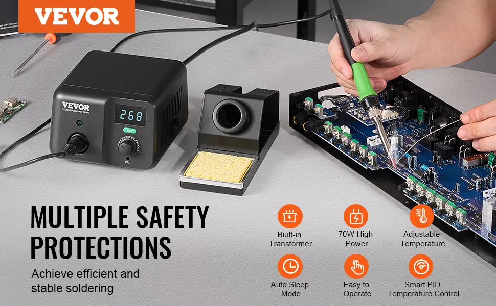 Liczne funkcje bezpieczeństwa zapewniają wydajne i stabilne lutowanie! Ta stacja lutownicza o mocy 70 W posiada wbudowany transformator, regulację temperatury, inteligentną kontrolę temperatury PID oraz automatyczny tryb uśpienia.