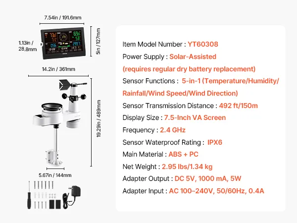 Stacja pogodowa VEVOR 5 w 1 z Wi-Fi, 7,5-calowy wyświetlacz VA, czujnik zewnętrzny zasilany energią słoneczną, centrum pogodowe z prognozą pogody, prędkością wiatru, kierunkiem wiatru, temperaturą, wilgotnością i opadami