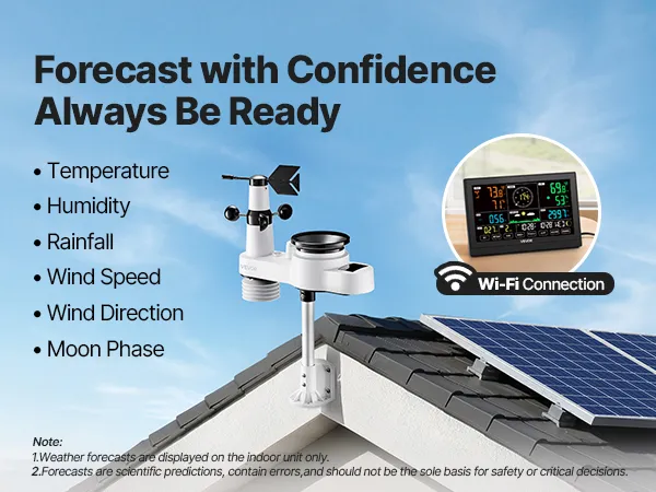Czujnik zewnętrzny 5 w 1: Monitoruj temperaturę, wilgotność, opady, prędkość i kierunek wiatru, a także punkt rosy, fazy księżyca i prognozy na 6-12 godzin. Nasza stacja pogodowa Wi-Fi dostarcza informacji pogodowych potrzebnych do inteligentniejszego planowania domu.