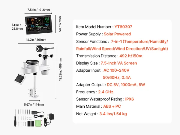 Stacja pogodowa VEVOR 7 w 1 z Wi-Fi i aplikacją, 7,5-calowy wyświetlacz VA, czujnik zewnętrzny zasilany energią słoneczną, centrum pogodowe z prognozą pogody, prędkością wiatru, temperaturą, wilgotnością i opadami
