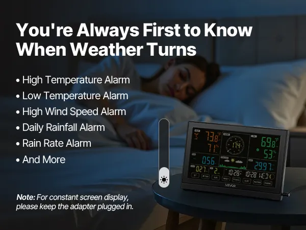 7,5-calowy wyświetlacz: Ciesz się krystalicznie czystym widokiem wszystkich danych pogodowych dzięki naszej bezprzewodowej stacji pogodowej. Duży wyświetlacz HD z 4 poziomami jasności idealnie pasuje do salonu lub sypialni i jest idealny do użytku w dzień i w nocy.