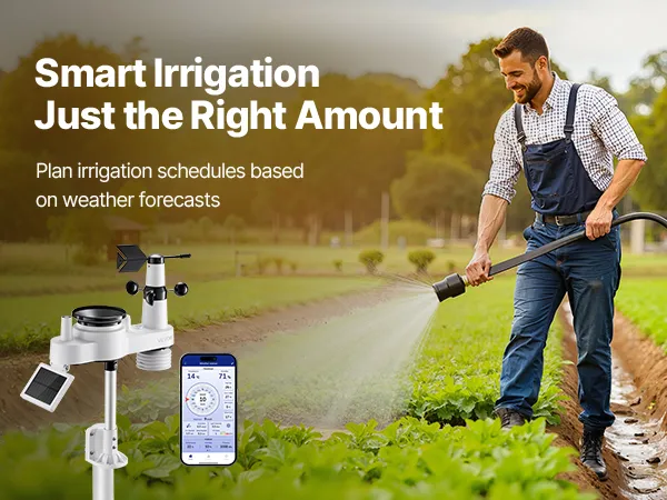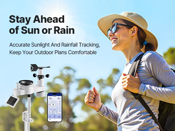Nasza bezprzewodowa stacja pogodowa monitoruje temperaturę, wilgotność, opady, prędkość i kierunek wiatru, promieniowanie słoneczne i wiele innych parametrów – wszystko na 7,5-calowym wyświetlaczu. Dzięki zasięgowi bezprzewodowemu do 150 m i wodoszczelnemu czujnikowi zewnętrznemu IPX6, idealnie nadaje się do stosowania na dachach, w ogrodach, na farmach i w wielu innych miejscach.