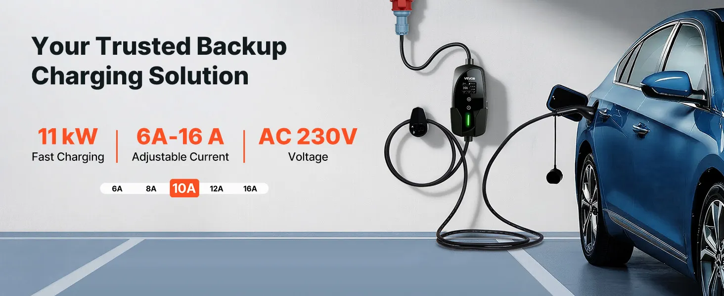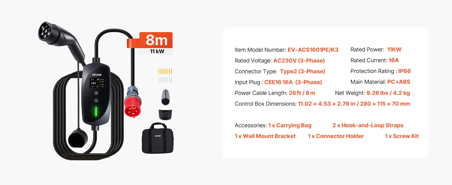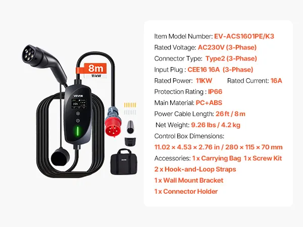 Mobilna stacja ładowania VEVOR, 11 kW 16 A, typ 2, przenośna ładowarka trójfazowa z 8-metrowym kablem ładującym, wtyczka CEE16, ekran LCD, jednostka sterująca IP66, zasilanie pojazdów elektrycznych