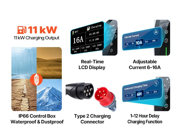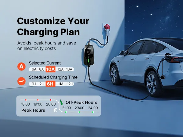 • Opóźnione ładowanie: Ta ładowarka do pojazdów elektrycznych typu 2 jest wyposażona w wyświetlacz LCD i czytelne wskaźniki, które pokazują stan ładowania w czasie rzeczywistym, a także komunikaty ostrzegawcze. Wystarczy ustawić opóźnienie od 1 do 12 godzin, aby uniknąć godzin szczytu, obniżyć koszty energii i ładować pojazd zgodnie z harmonogramem.