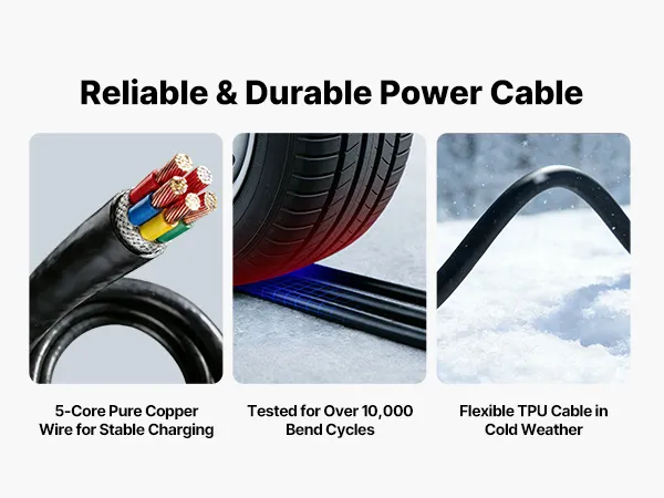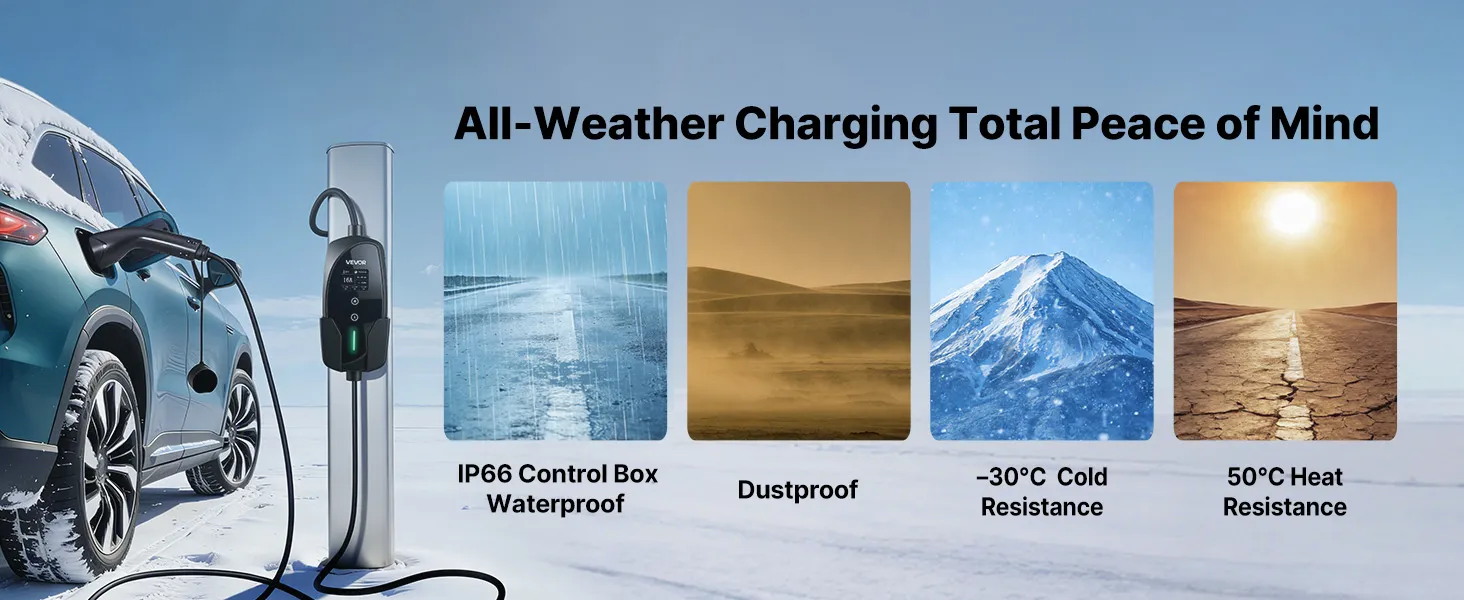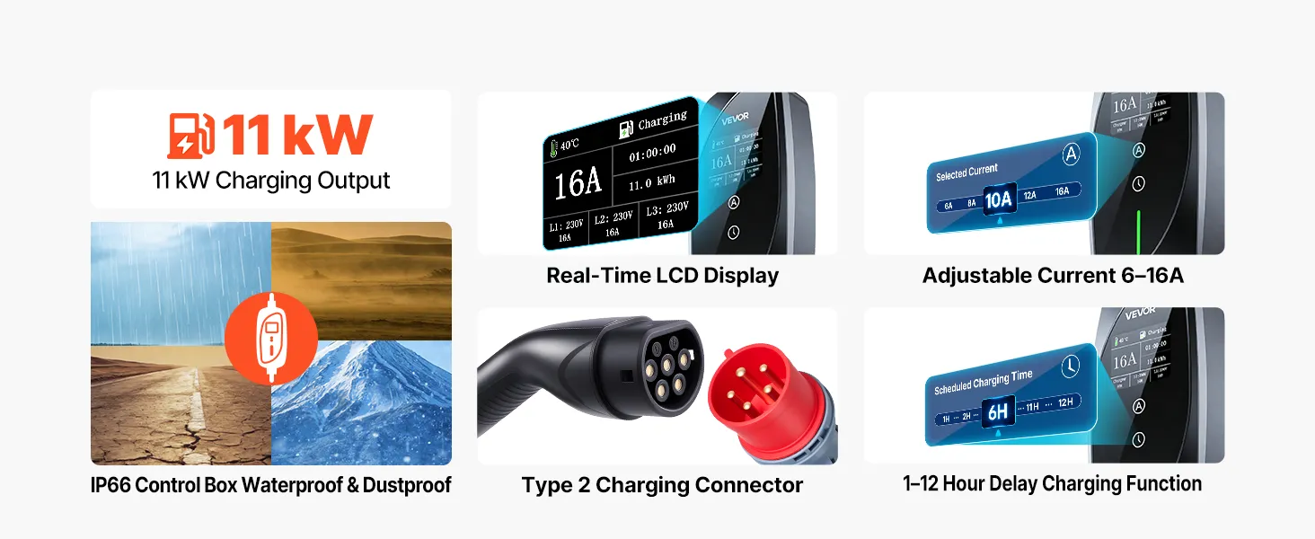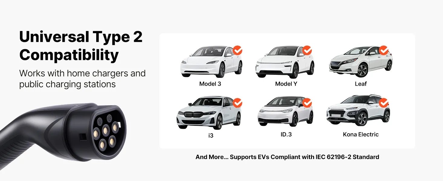 • Uniwersalna kompatybilność typu 2: Ta stacja ładowania pojazdów elektrycznych jest kompatybilna z większością pojazdów elektrycznych typu 2 i publicznymi stacjami ładowania prądem zmiennym. Jest kompatybilna z modelami Model 3 Y, Leaf, i3, ID.3, Kona Electric i innymi pojazdami elektrycznymi zgodnymi z normą IEC 62196-2.