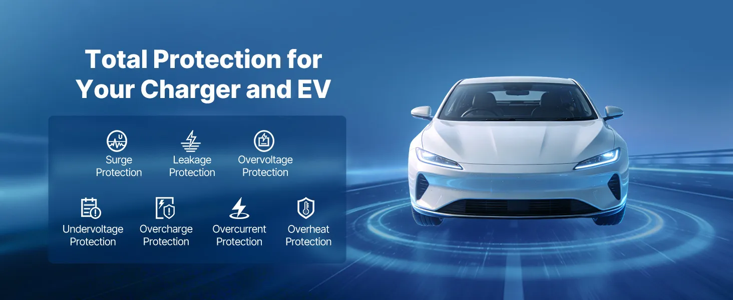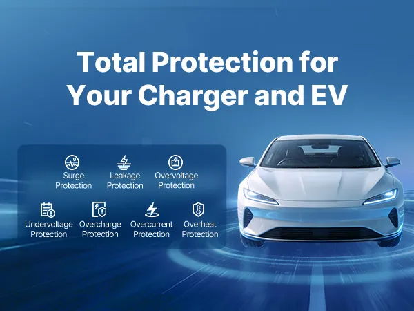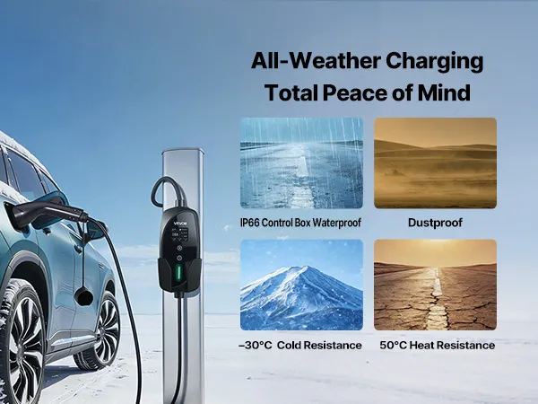 • Kompleksowa ochrona: Ta ładowarka do pojazdów elektrycznych zapewnia ochronę przed przepięciem, prądem upływowym, zwarciem doziemnym, przepięciem, zbyt niskim napięciem, przetężeniem, przegrzaniem i przeładowaniem. Jednostka sterująca o stopniu ochrony IP66 gwarantuje niezawodne ładowanie w deszczu, śniegu, upale i zimnie.