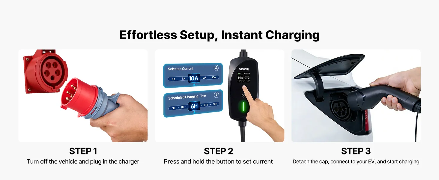 Ta przenośna ładowarka ścienna oferuje regulowany prąd ładowania od 6 do 16 A i 8-metrowy kabel ładujący z TPU. Zaplanuj ładowanie z opóźnieniem od 1 do 12 godzin, aby uniknąć szczytowych kosztów energii elektrycznej. Różne funkcje zabezpieczające zapewniają niezawodne ładowanie nawet w deszczu i śniegu.