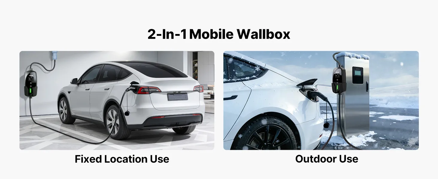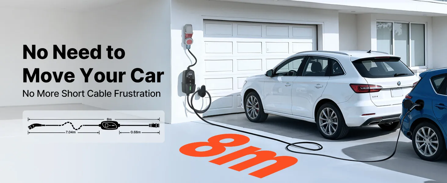 • Mobilna stacja ładowania Wallbox 2 w 1: Dzięki 8-metrowemu kablowi, ta stacja ładowania samochodów elektrycznych z łatwością dociera przez podjazdy i garaże – idealna dla gospodarstw domowych z wieloma samochodami elektrycznymi, bez konieczności ich przestawiania. Kompaktowa i poręczna, oferuje elastyczne ładowanie w domu i w podróży.