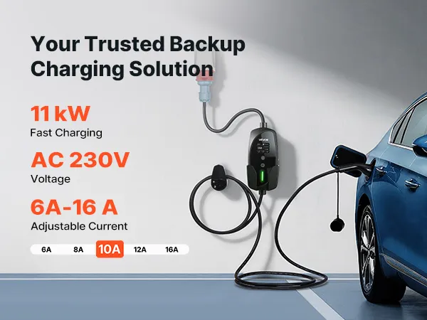 • Trzykrotnie szybsze ładowanie: Ta przenośna stacja ładowania pojazdów elektrycznych zapewnia zasięg około 104 km/h – trzykrotnie szybszy niż ładowanie jednofazowe z prędkością 34 km/h. Wyposażona jest w trójfazową wtyczkę typu 2 i CEE16 (230 V x 16 A x 3) z regulowanym prądem ładowania od 6 do 16 A i maksymalną mocą ładowania 11 kW.