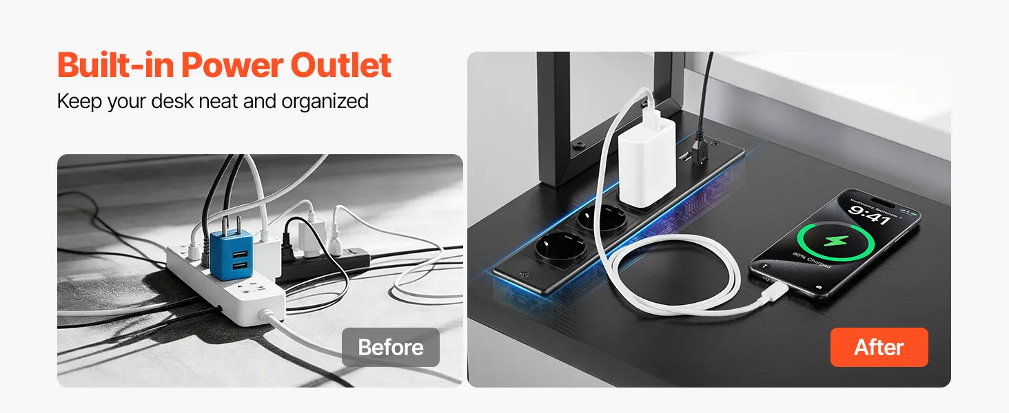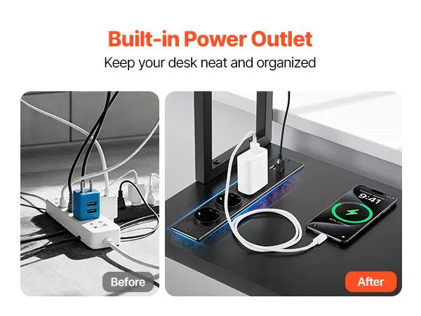 Zintegrowane gniazdo zasilania: Wygodnie ładuj swoje urządzenia za pośrednictwem 3 portów AC i 2 portów USB, dzięki czemu Twoje biurko do gier lub domowe biuro będzie uporządkowane i gotowe do pracy lub zabawy.