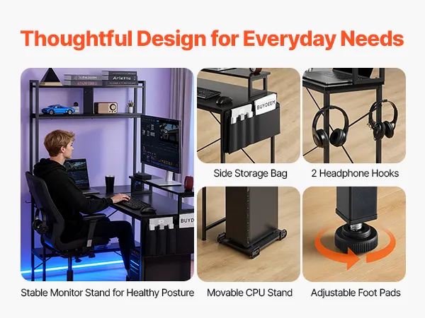 Dużo miejsca do przechowywania: Nasze narożne biurko komputerowe w kształcie litery L posiada dwie otwarte półki, łatwo dostępną dolną komorę, boczną kieszeń do przechowywania oraz dwa haczyki na słuchawki, co zapewnia elastyczne opcje przechowywania. Dzięki temu możesz uporządkować najważniejsze rzeczy i szybko uzyskać dostęp do często używanych rzeczy.