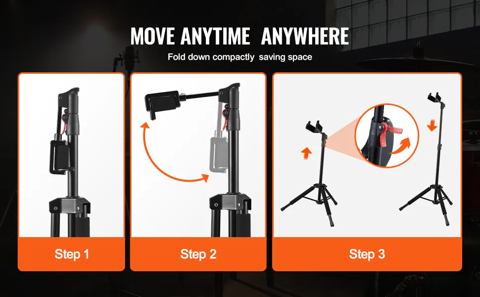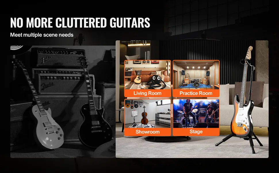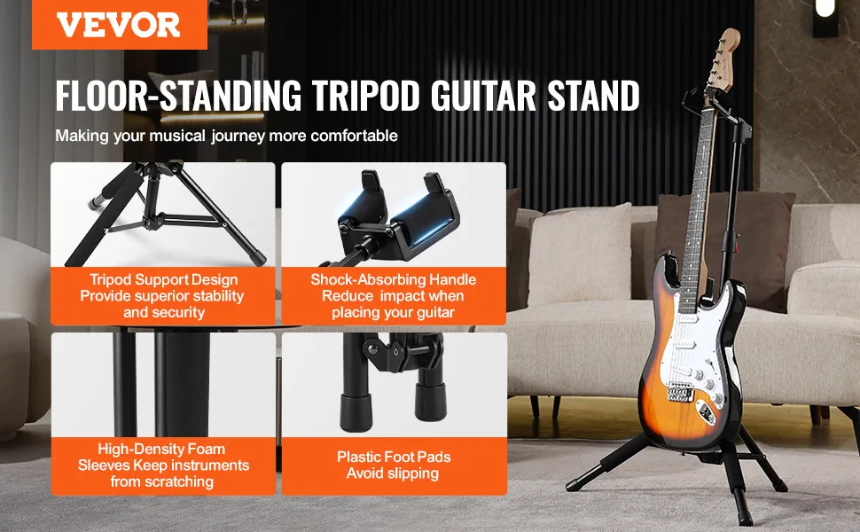 Statyw na gitarę VEVOR Tripod oferuje niezrównaną stabilność. Chroni gitarę przed przypadkowymi upadkami. Składany stojak na gitarę pochłania wstrząsy i wibracje na scenie. Ta funkcja zapewnia, że Twój instrument pozostanie nienaruszony. Jego wszechstronność i niezawodność sprawiają, że jest to fantastyczny wybór dla wszystkich muzyków. Ulepsz swoje występy dzięki statywom, które stawiają na pierwszym miejscu bezpieczeństwo Twoich instrumentów.