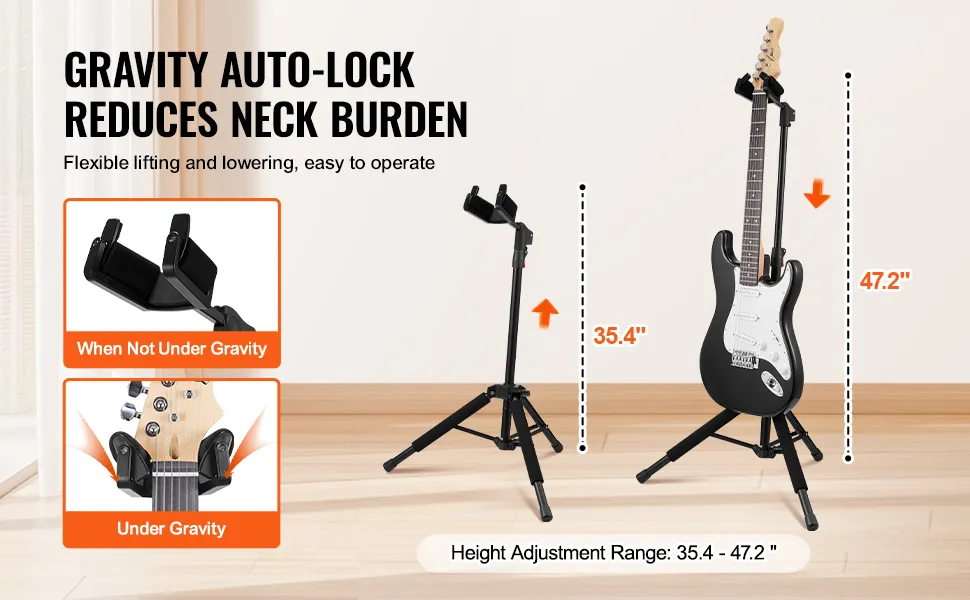 Ten stojak na gitarę o wymiarach 35,4–47,2 cala może pomieścić różne rozmiary gryfu. Pasuje do gryfów gitarowych o średnicy od 1,73 do 2,05 cala. Ta cecha sprawia, że nadaje się do wielu instrumentów. Obsługuje gitary akustyczne, gitary elektryczne, basy, mandoliny i banjo. Wąska regulacja gryfu zapewnia ścisłe dopasowanie. Ten stojak doskonale sprawdza się zarówno w przypadku małych, jak i dużych instrumentów. Możesz go używać z dowolnym instrumentem bez konieczności kompromisu w kwestii jakości.