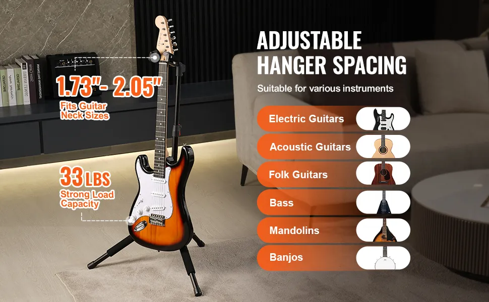 Ten stojak jest idealny do różnych gitar. Obsługuje gitary akustyczne i elektryczne. Pasuje również do basów, mandolin i banjo. Wszechstronność stojaka sprawia, że jest on idealnym wyborem dla wszystkich muzyków. Możesz uzyskać niezawodne wsparcie dla różnych typów instrumentów. Ciesz się wygodą posiadania jednego stojaka dla wielu gitar. Ta funkcja jest szczególnie przydatna dla muzyków z różnorodnymi kolekcjami. Statyw gitarowy VEVOR Tripod spełnia wszystkie Twoje potrzeby.
