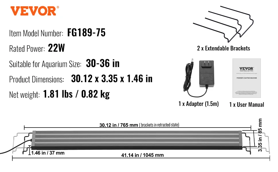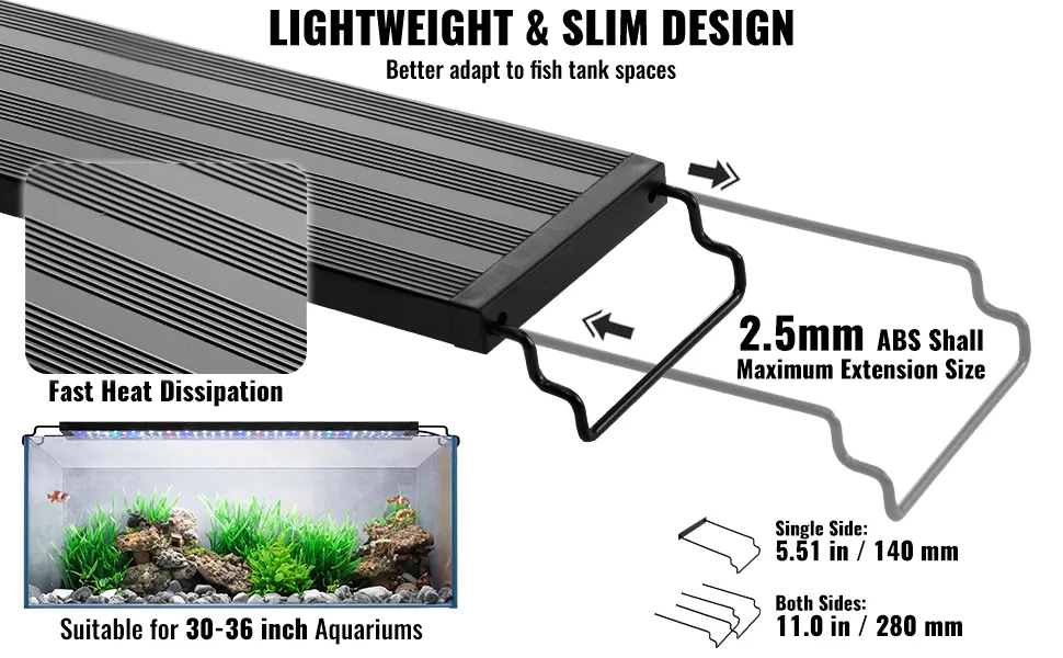 Szerokie zastosowanie: Lampy akwariowe LED VEVOR, zaprojektowane do akwariów o średnicy 76-91 cm (30-36 cali), posiadają dwa wysuwane uchwyty o maksymalnym wysięgu 13,97 cm (5,5 cala) z jednej strony i 27,94 cm (11 cali) z obu stron. Dzięki temu można je łatwo zamontować w większości akwariów szklanych lub akrylowych, z przezroczystą pokrywą lub bez, z rantem lub bez. Nadają się zarówno dla początkujących, jak i doświadczonych akwarystów.