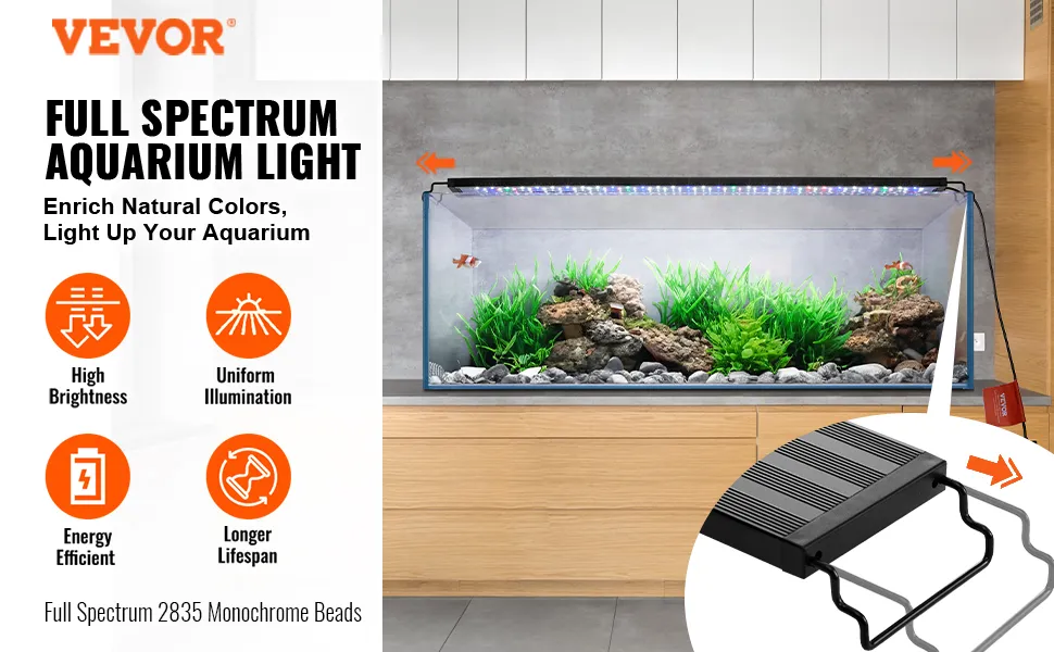 Oświetlenie akwariowe VEVOR, wyposażone w 5 rzędów 2835 monochromatycznych diod LED o pełnym spektrum, 5 poziomów jasności i regulowany timer, zapewnia wysoką jasność, równomierne oświetlenie i energooszczędność, dzięki czemu Twoje akwarium ożyje, a podwodny świat stanie się żywy.