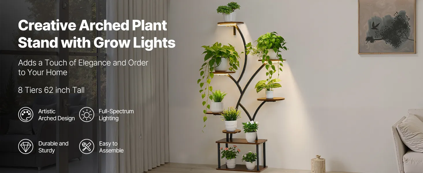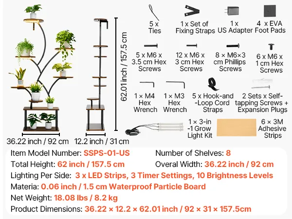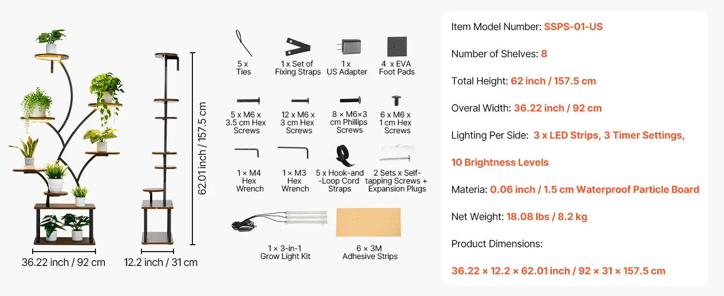 Łatwy montaż: Ten podświetlany stojak na rośliny jest dostarczany ze wszystkimi niezbędnymi narzędziami, w tym śrubokrętem i kluczem francuskim, a także ze szczegółową instrukcją szybkiego montażu. W zestawie znajdują się dodatkowe łączniki i paski, które zabezpieczają stojak, dzięki czemu jest bezpieczny nawet w domach z dziećmi lub zwierzętami.