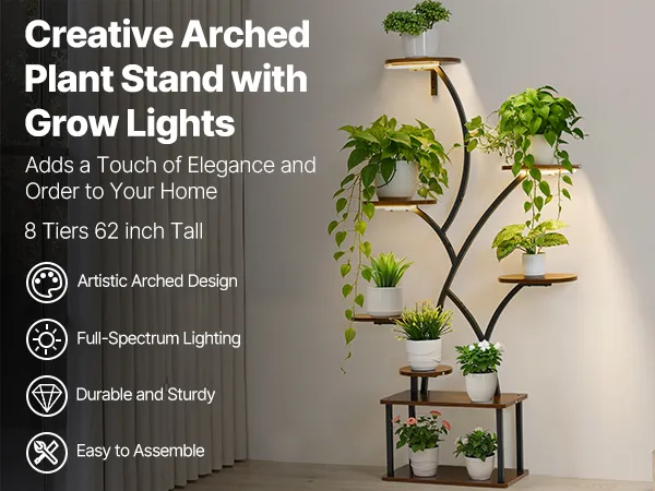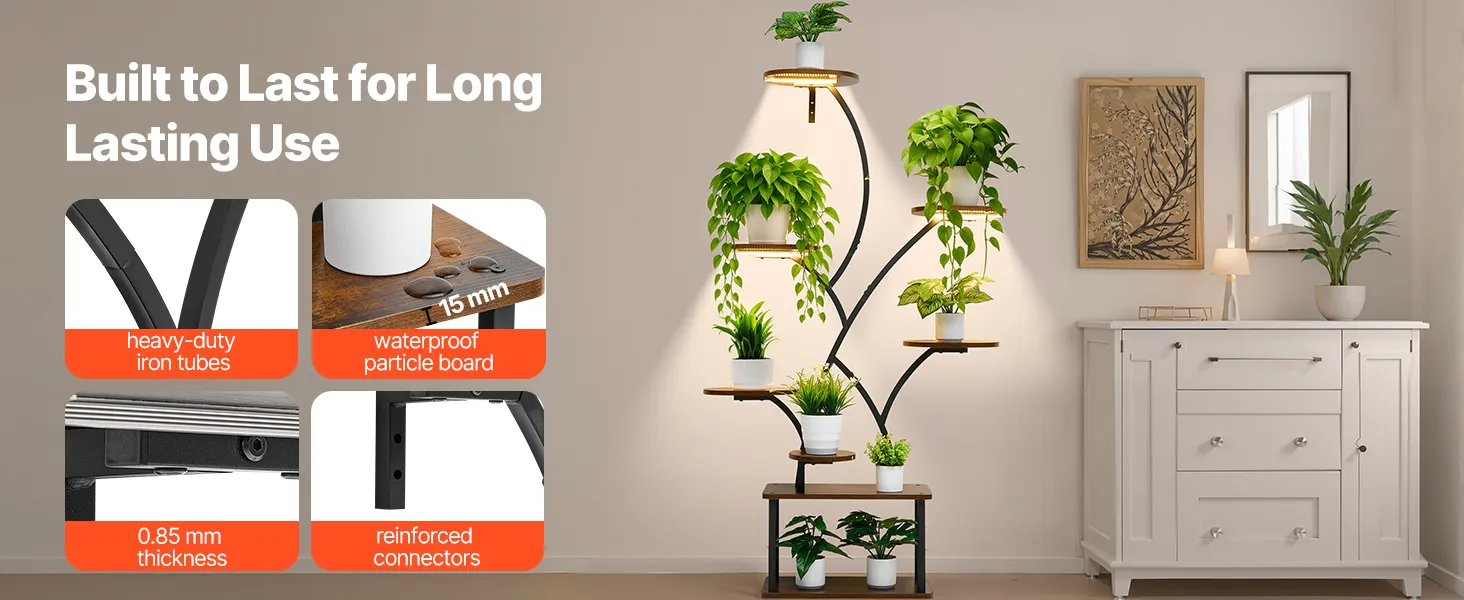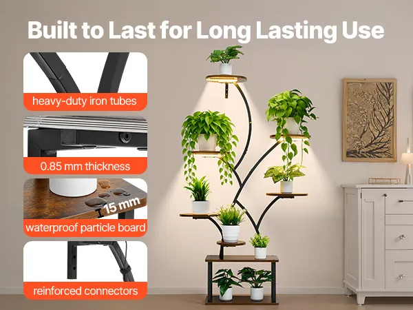 Ten podświetlany stojak na rośliny, wykonany z rur żelaznych o grubości 0,85 mm, jest trwały. Stelaż pokryty jest odporną na rdzę powłoką proszkową, co wydłuża jego żywotność. Grube półki z płyty wiórowej z wodoodpornym wykończeniem zapobiegają odkształcaniu, pękaniu i korozji. Dołączone łączniki i paski zapobiegają przewróceniu.