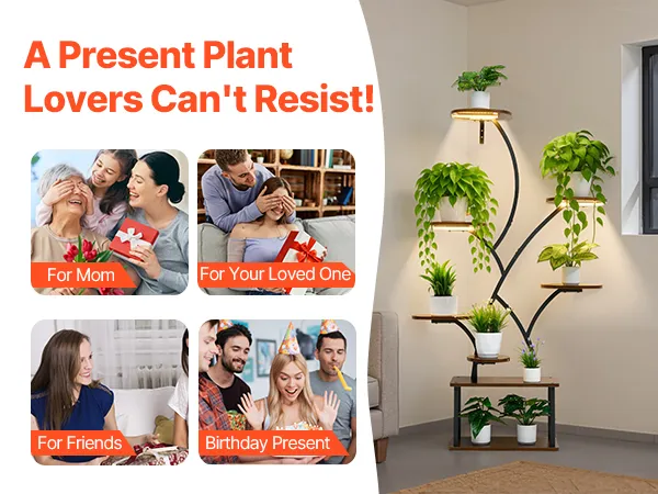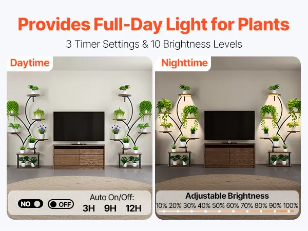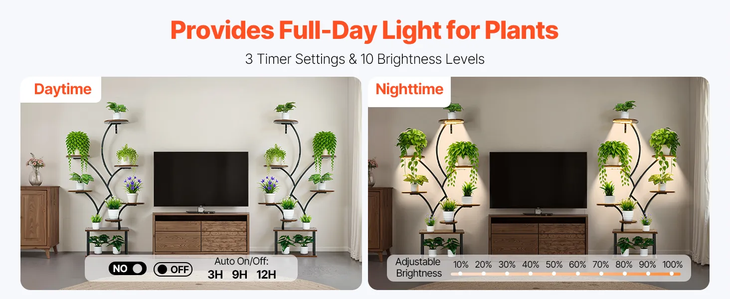 3 lampy o pełnym spektrum światła: Dzięki 3 regulowanym lampom, które wspierają zdrowy wzrost na każdym etapie, ten stojak do roślin doniczkowych zapewnia odpowiednią ilość światła na każdym poziomie. 3 ustawienia timera (3 godz./9 godz./12 godz.) i 10 poziomów jasności oferują różnorodne opcje oświetlenia.