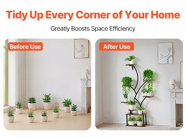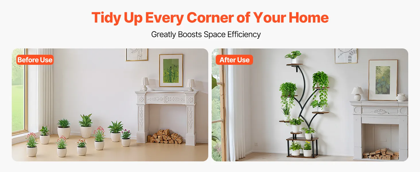 Dzięki licznym półkom, ten stojak na rośliny oferuje mnóstwo miejsca na małe i średnie rośliny doniczkowe, książki lub przedmioty dekoracyjne. Jego przemyślana pionowa konstrukcja maksymalizuje przestrzeń na podłodze, dzięki czemu idealnie nadaje się do narożników lub niewielkich wnętrz, a jednocześnie pozwala zachować porządek w domu.