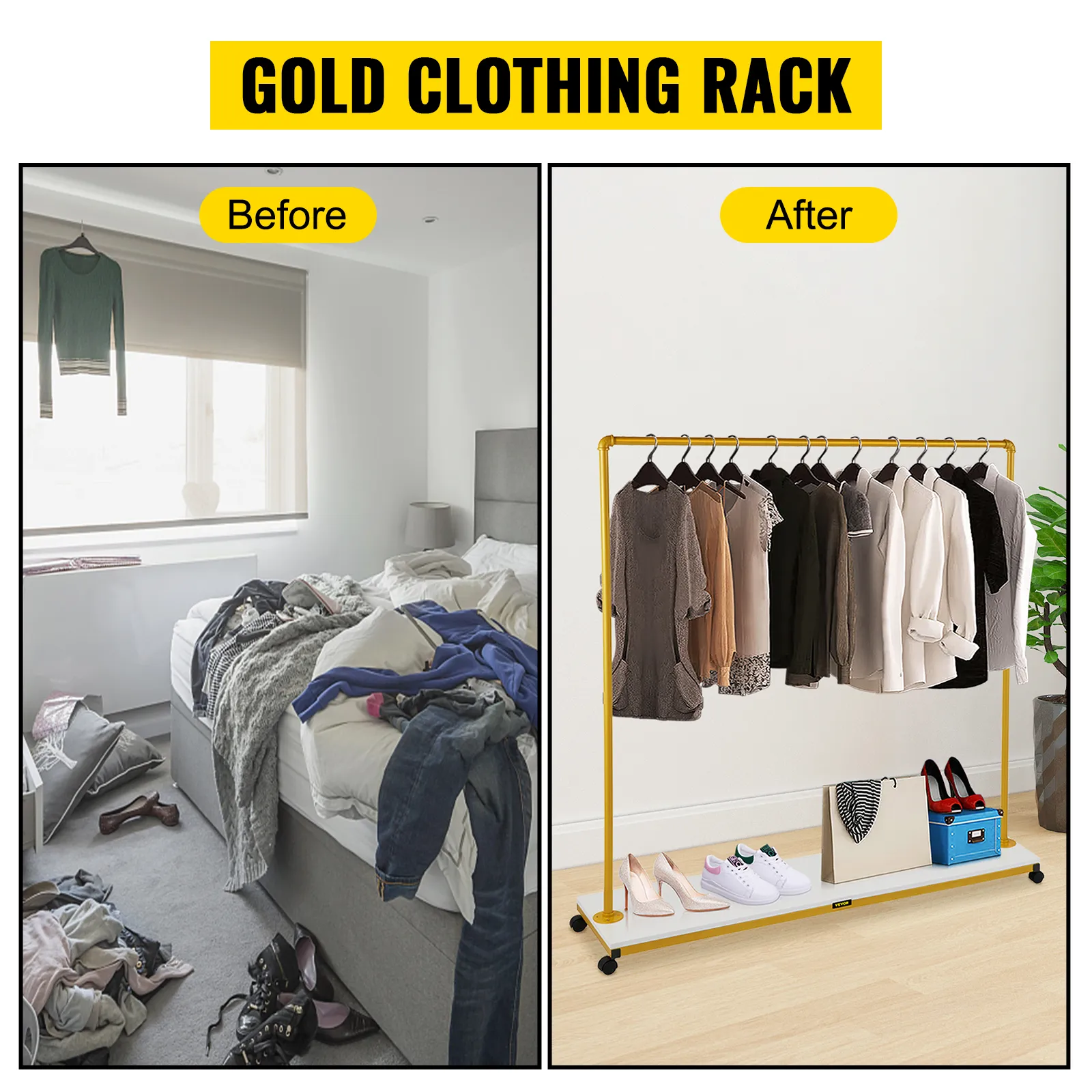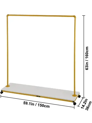 Nasz wieszak na ubrania na kółkach zapewnia dodatkowe miejsce do przechowywania ubrań i akcesoriów. Błyszcząca złota i biała półka sprawia, że ten stylowy wieszak na ubrania jest elementem dekoracyjnym sklepów odzieżowych, butików i sklepów detalicznych. Doskonale nadaje się do zaprezentowania szykownej odzieży w atrakcyjny i elegancki sposób.
