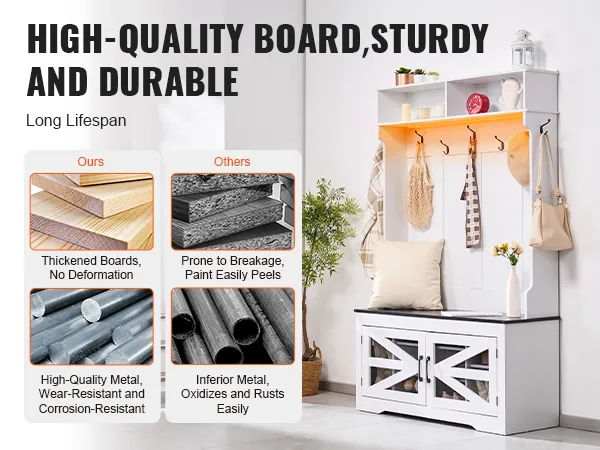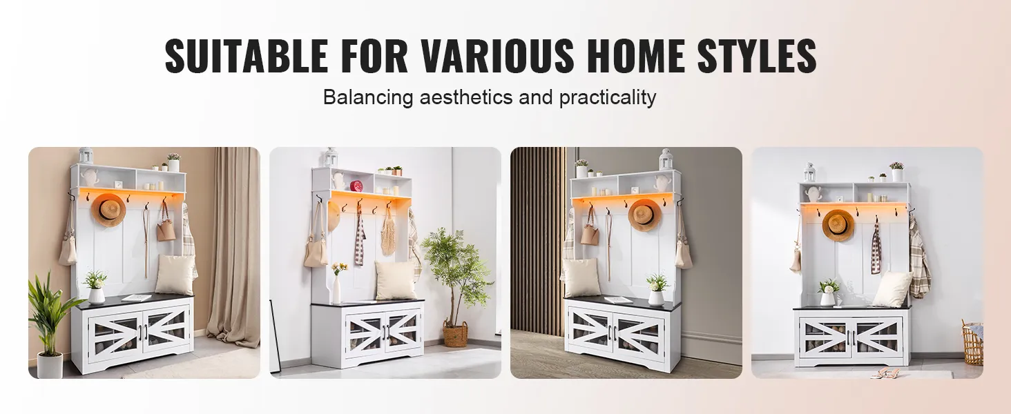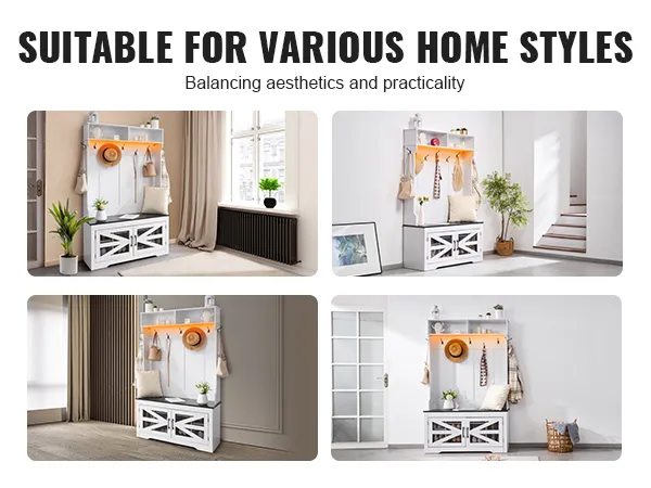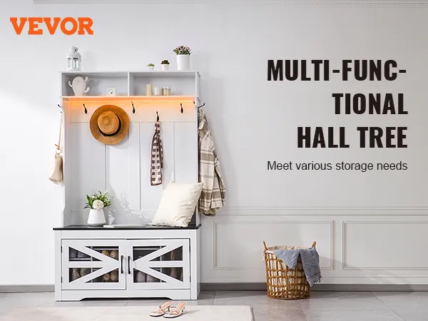 VEVOR Drewniany wieszak na ubrania z ławką i półką na buty, biały wieszak na ubrania z regulowanymi półkami, 7 haczykami, 4 szufladami i listwą świetlną USB, do przedpokoju i korytarza