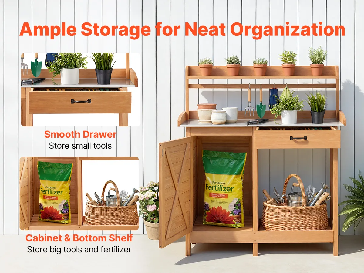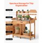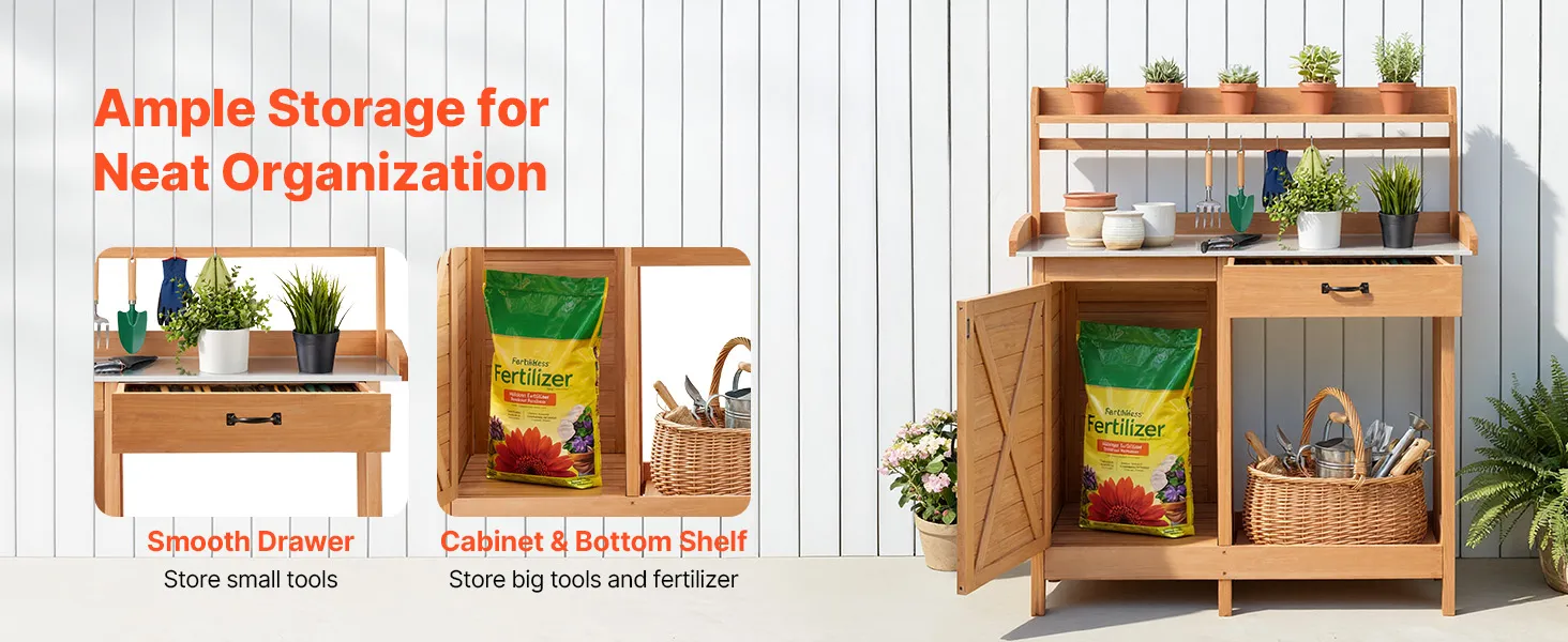Stół do sadzenia VEVOR, stół ogrodnika, stół roboczy do ogrodu z szafką dolną, ocynkowany blat żeliwny, szuflada, półki i haczyki, stolik na kwiaty, szafka ogrodowa na taras i do ogrodu, 1120 x 465 x 1255 mm