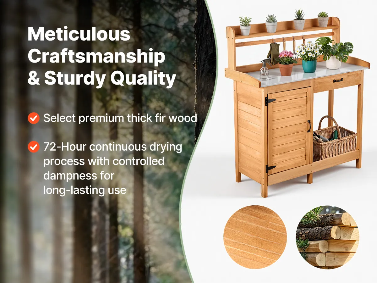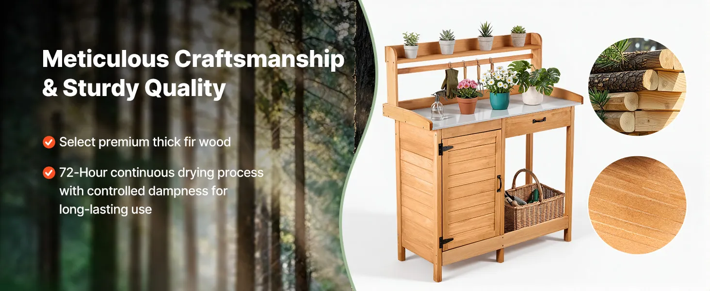 Solidny i trwały: Ten stolik do sadzonek, wykonany z wysokiej jakości drewna jodłowego, jest odporny na gnicie i wyjątkowo trwały. Powierzchnia drewna pokryta jest grubą, niezawodną farbą na bazie wody i jest odporna na wilgoć panującą na zewnątrz.