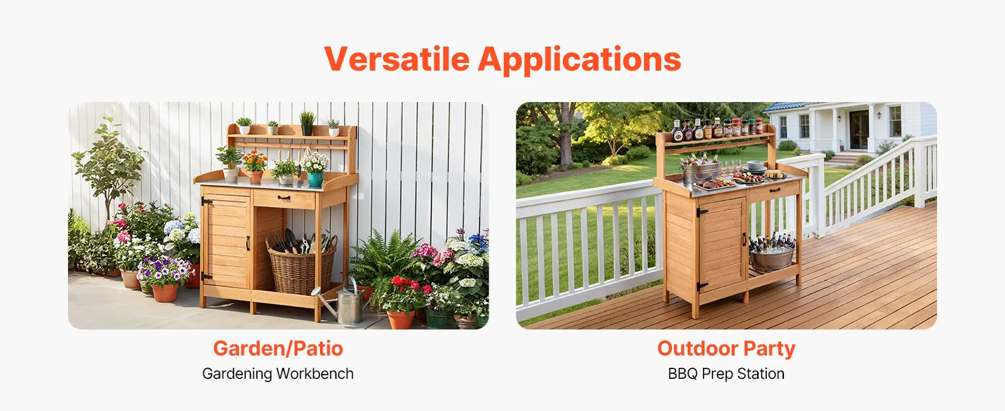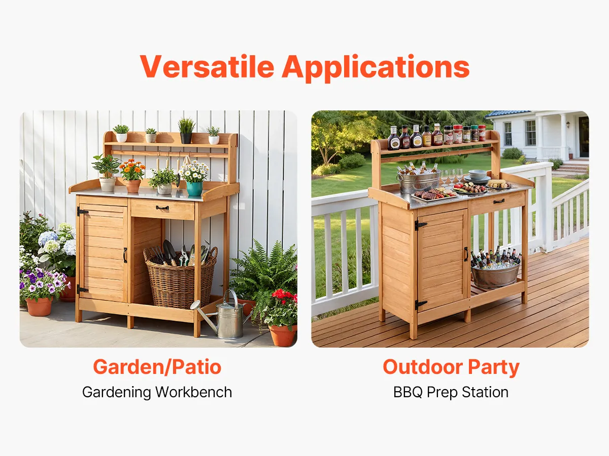 Wszechstronne zastosowanie: Ten stół ogrodowy nadaje się jako blat roboczy w ogrodzie lub na tarasie do pielęgnacji roślin, a także jako stanowisko do przygotowywania grilla – idealne do podawania składników i napojów.