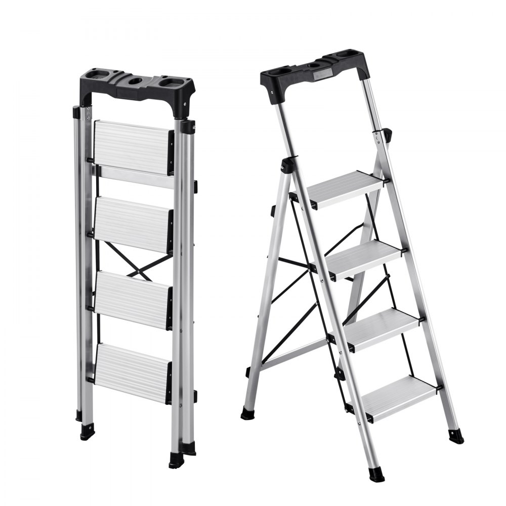 VEVOR 4-stopniowa składana drabina z antypoślizgowymi stopniami i wygodną rączką, drabina domowa o udźwigu 150 kg, aluminiowa drabina bezpieczeństwa do kuchni, domu, magazynu i biura, srebrna