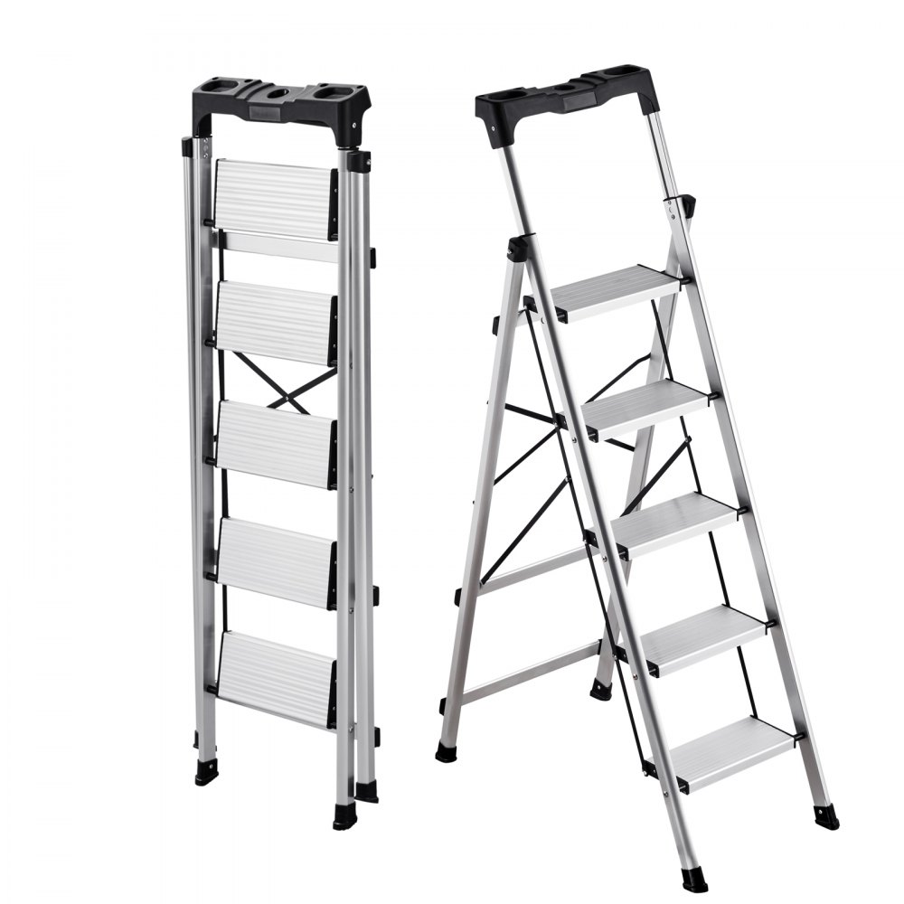 VEVOR 5-stopniowa składana drabina z antypoślizgowymi stopniami i wygodną rączką, drabina domowa o udźwigu 150 kg, aluminiowa drabina bezpieczeństwa do kuchni, magazynu, domu i biura, srebrna