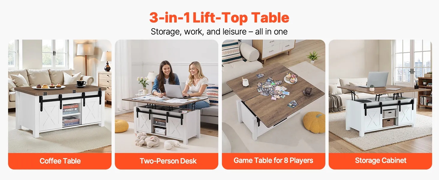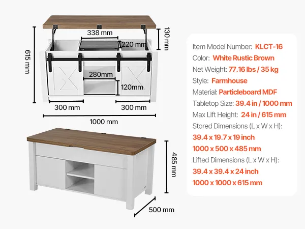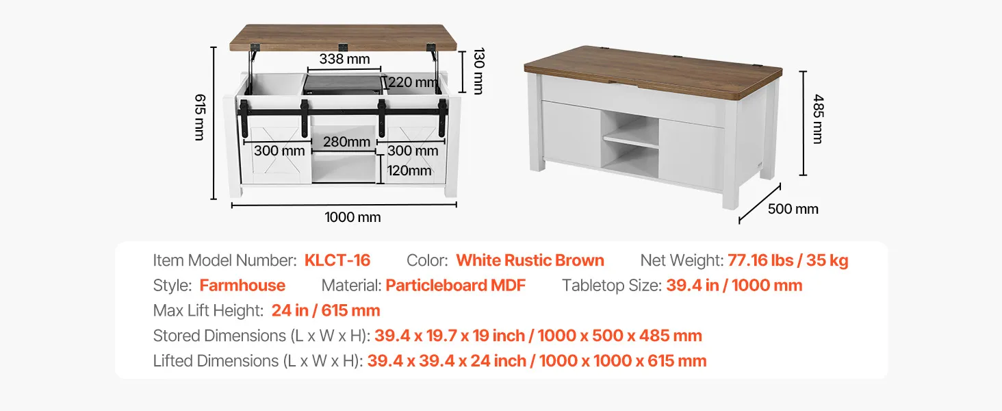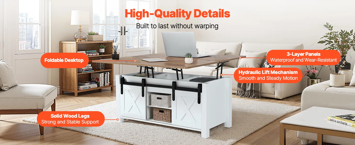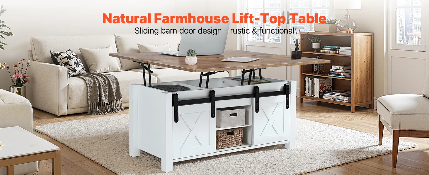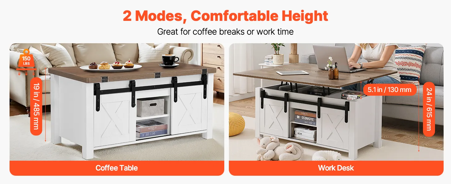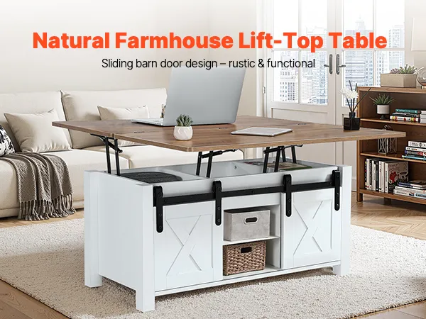 VEVOR Stolik kawowy z podnoszonym blatem 100 cm, rustykalny stolik kawowy z drzwiami stodołowymi i ukrytym schowkiem, prostokątny stół podnoszony z blatem do salonu, biura, domu, stolik kawowy do salonu, stolik kawowy, stolik kawowy, brązowo-biały