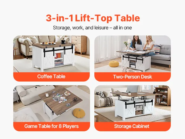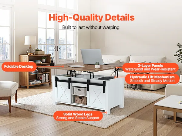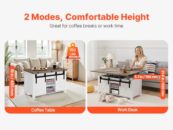 Wszechstronność w jednym: Przełącz się od relaksu do pracy w mgnieniu oka – oszczędza miejsce, jest wydajny i zaprojektowany z myślą o nowoczesnej wielozadaniowości. Stolik kawowy z podnoszonym blatem można unieść nawet o 615 mm (24 cale), osiągając idealną wysokość do relaksującej pracy.