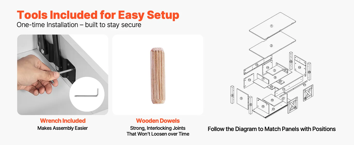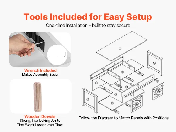 W zestawie znajduje się cały niezbędny sprzęt umożliwiający bezproblemowy montaż, a także poręczny klucz i drewniane kołki, które gwarantują solidną i trwałą instalację już od pierwszej instalacji.