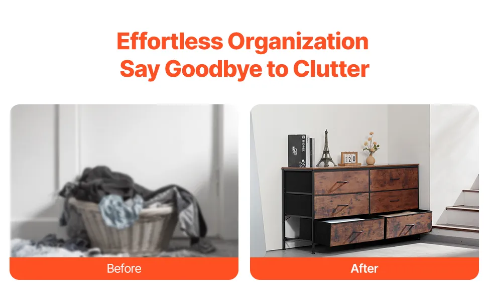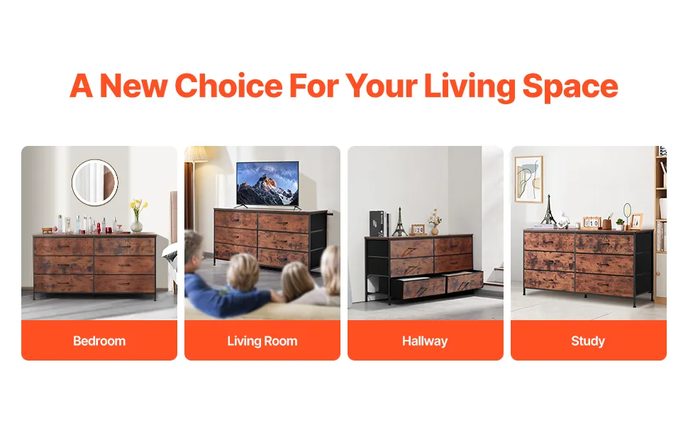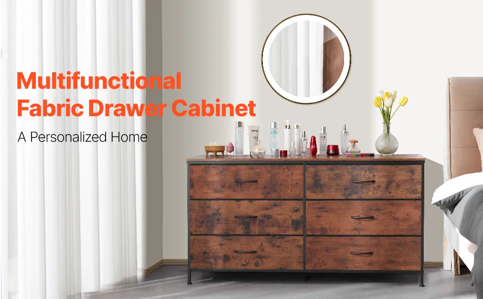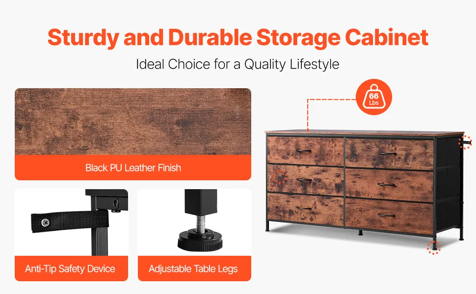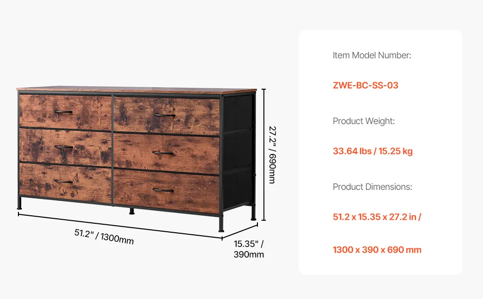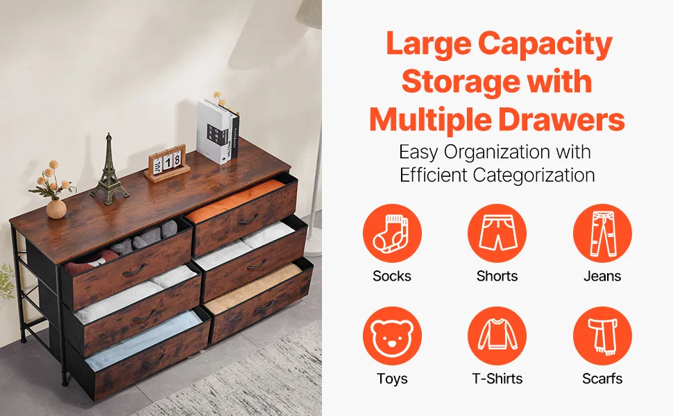 VEVOR Stojak pod telewizor z 6 szufladami i miejscem do przechowywania, szuflady z solidną stalową ramą, wieża do przechowywania tkanin do sypialni i przedpokoju, rustykalny brąz
