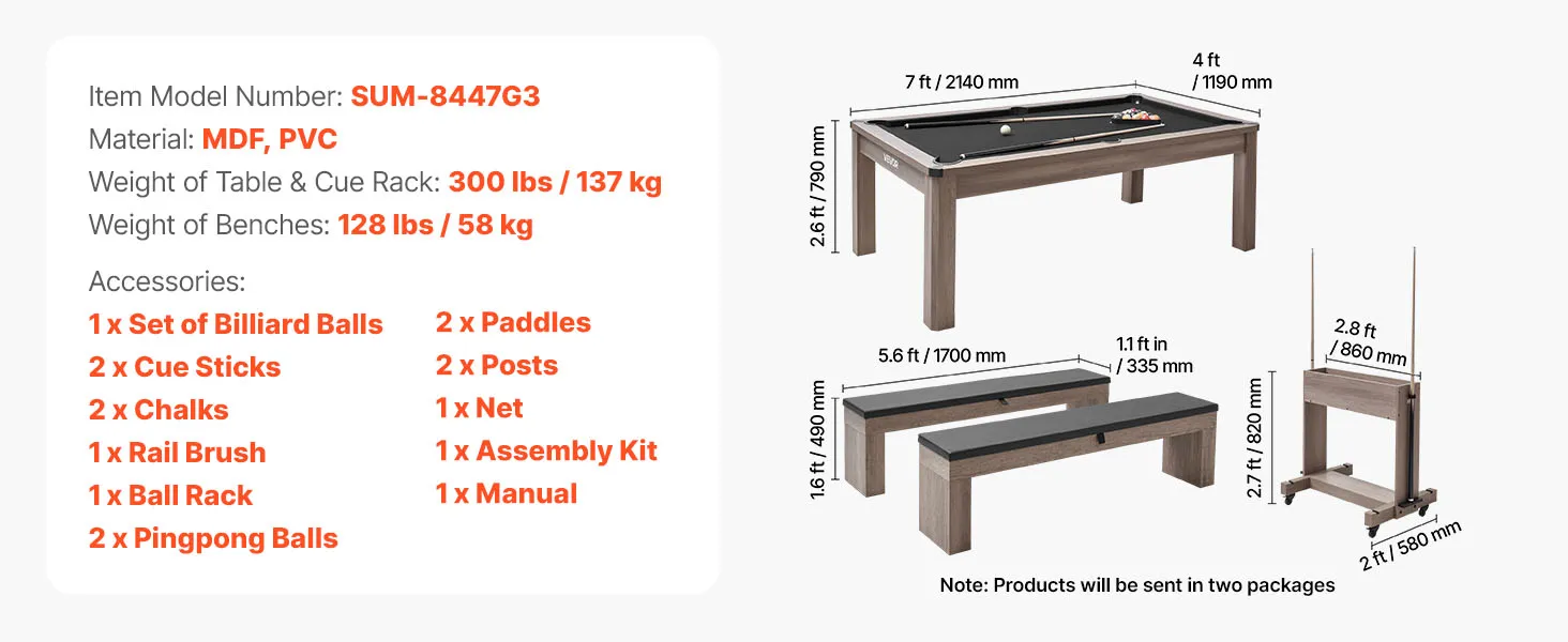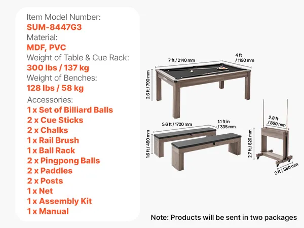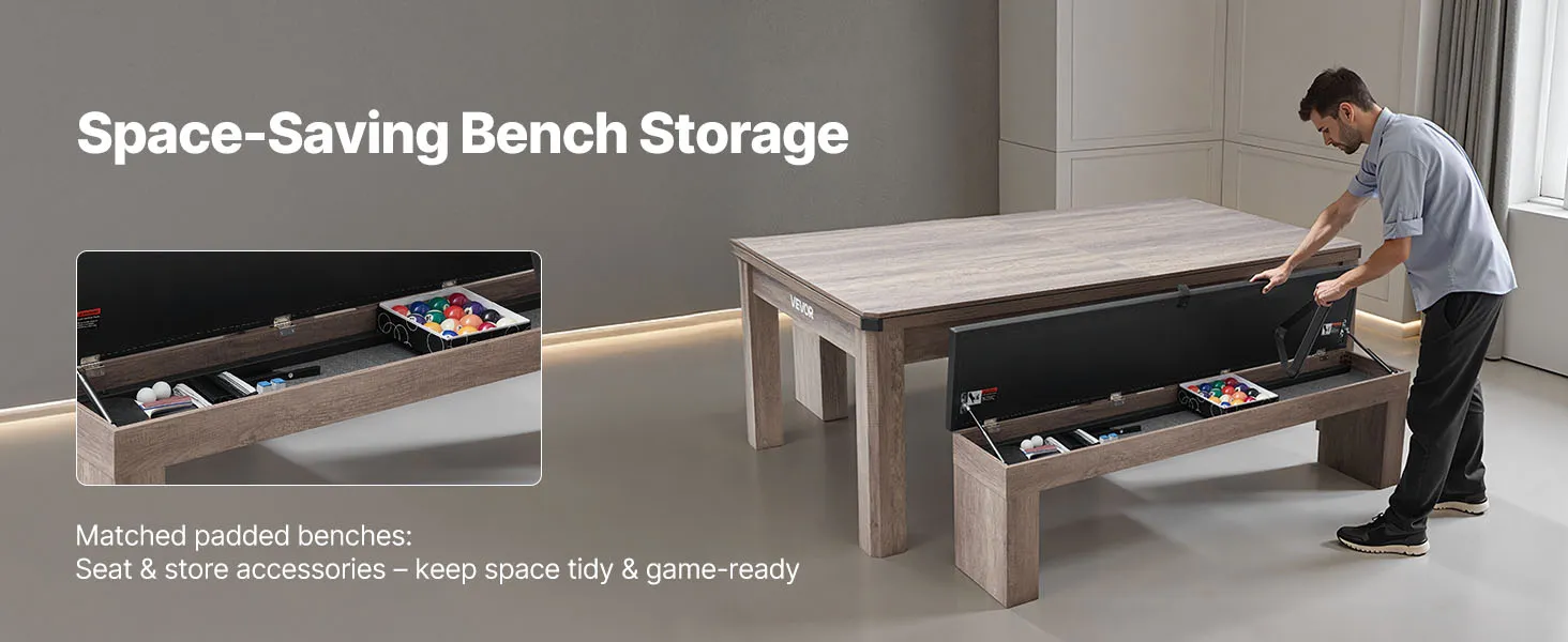 Stół bilardowy VEVOR 214 cm 3 w 1 do gier stołowych ze stołem jadalnym i stołem do tenisa stołowego, 2 ławkami do przechowywania i akcesoriów, nośność 137 kg, w zestawie stojak na kije i szczotka do kredy